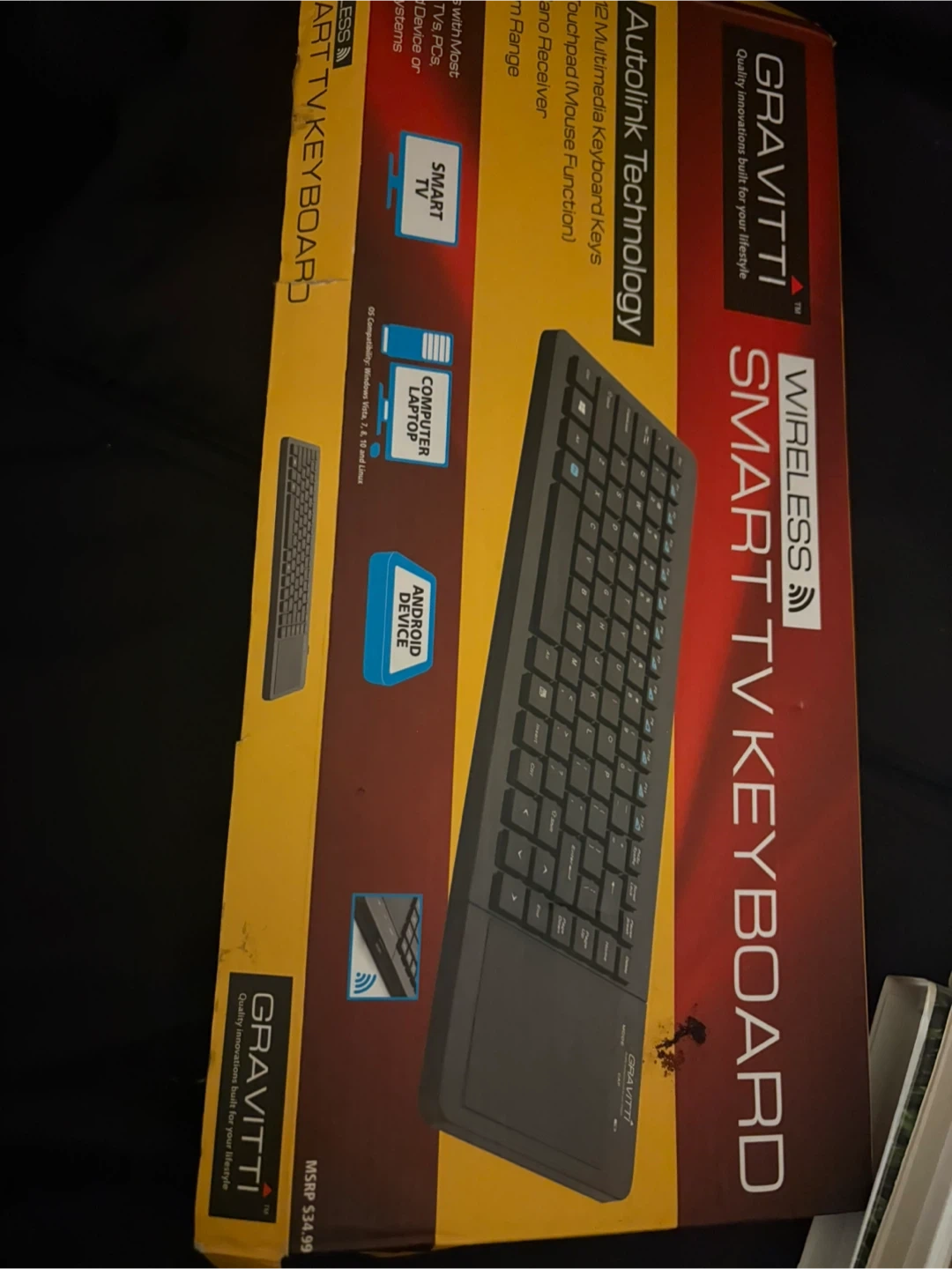 This is a GRAVITTI Wireless Smart TV Keyboard with a built-in touchpad. It's designed for multimedia use. It connects wirelessly and includes a USB receiver.