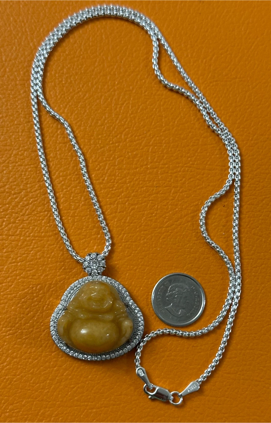 A lovely sterling silver necklace (925) featuring a carved rare golden jade Buddha pendant. The intricate filigree design on the back of the pendant adds a touch of elegance. It's perfect for everyday wear or as a unique gift! Unisex Fashion. With Certificate of Authenticity.