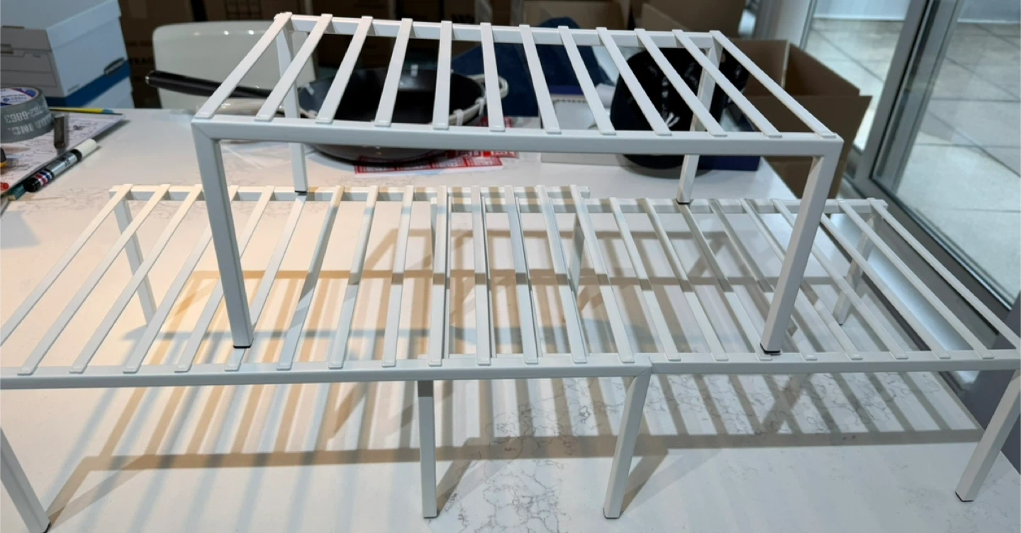 Three white metal stackable storage shelves. These shelves are designed to expand your cabinet or pantry space. They're made of durable metal with a white finish.