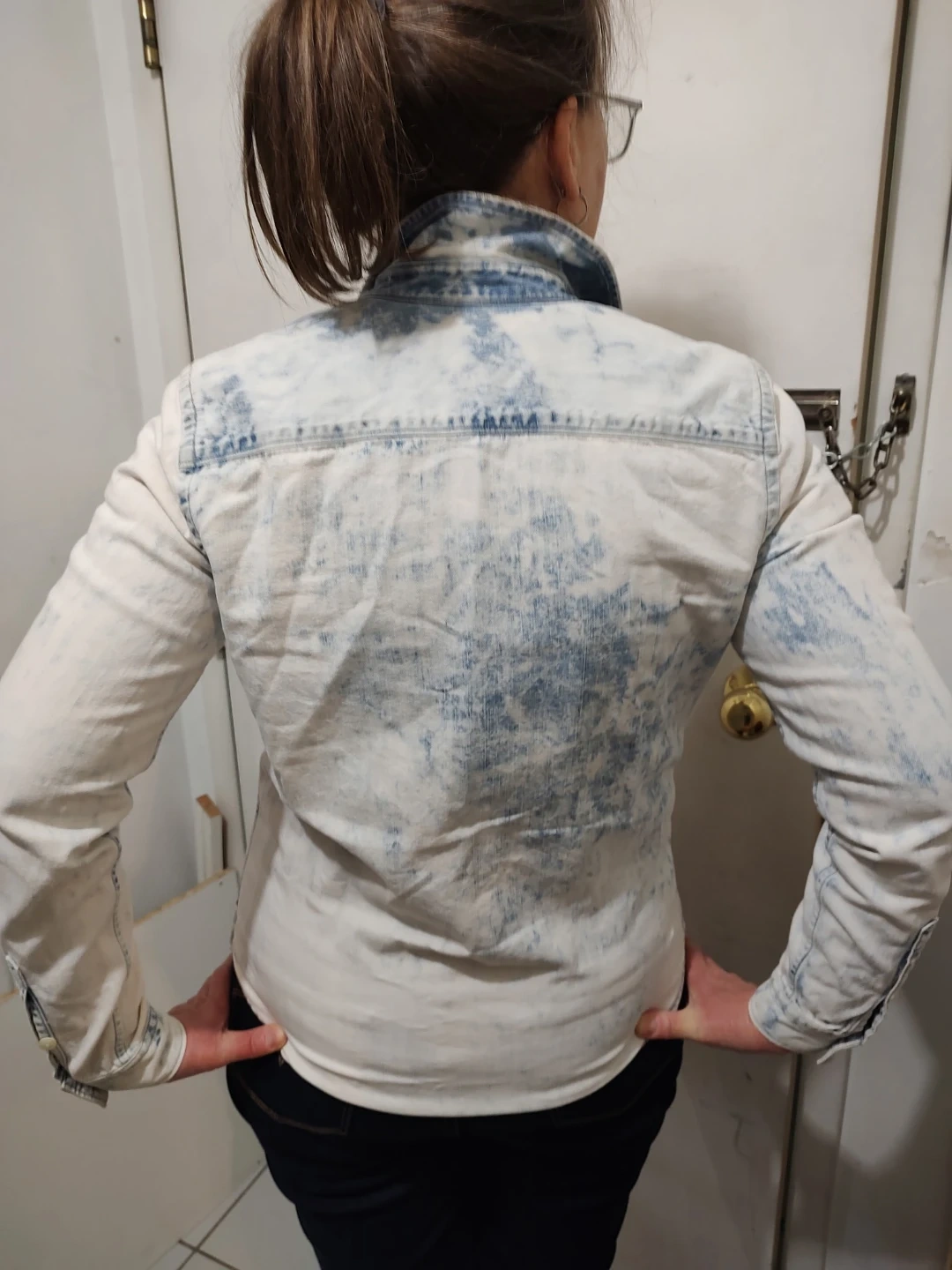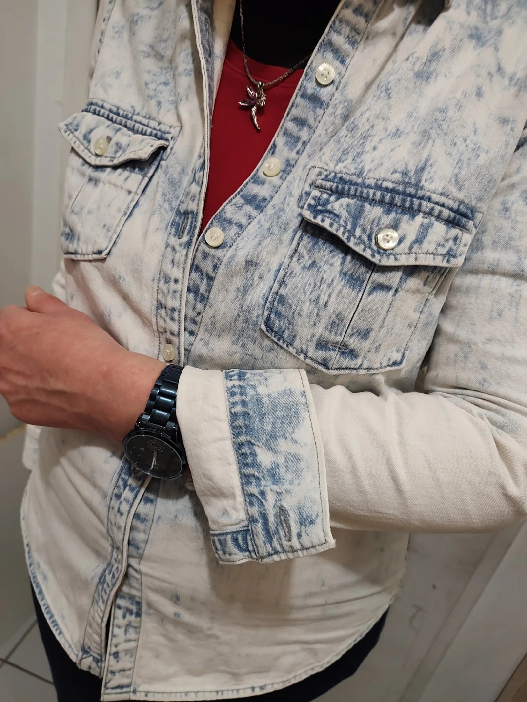 I'm selling an acid wash denim shirt! It has a unique, faded look and classic button-down style. Perfect for casual wear or layering. In great condition!