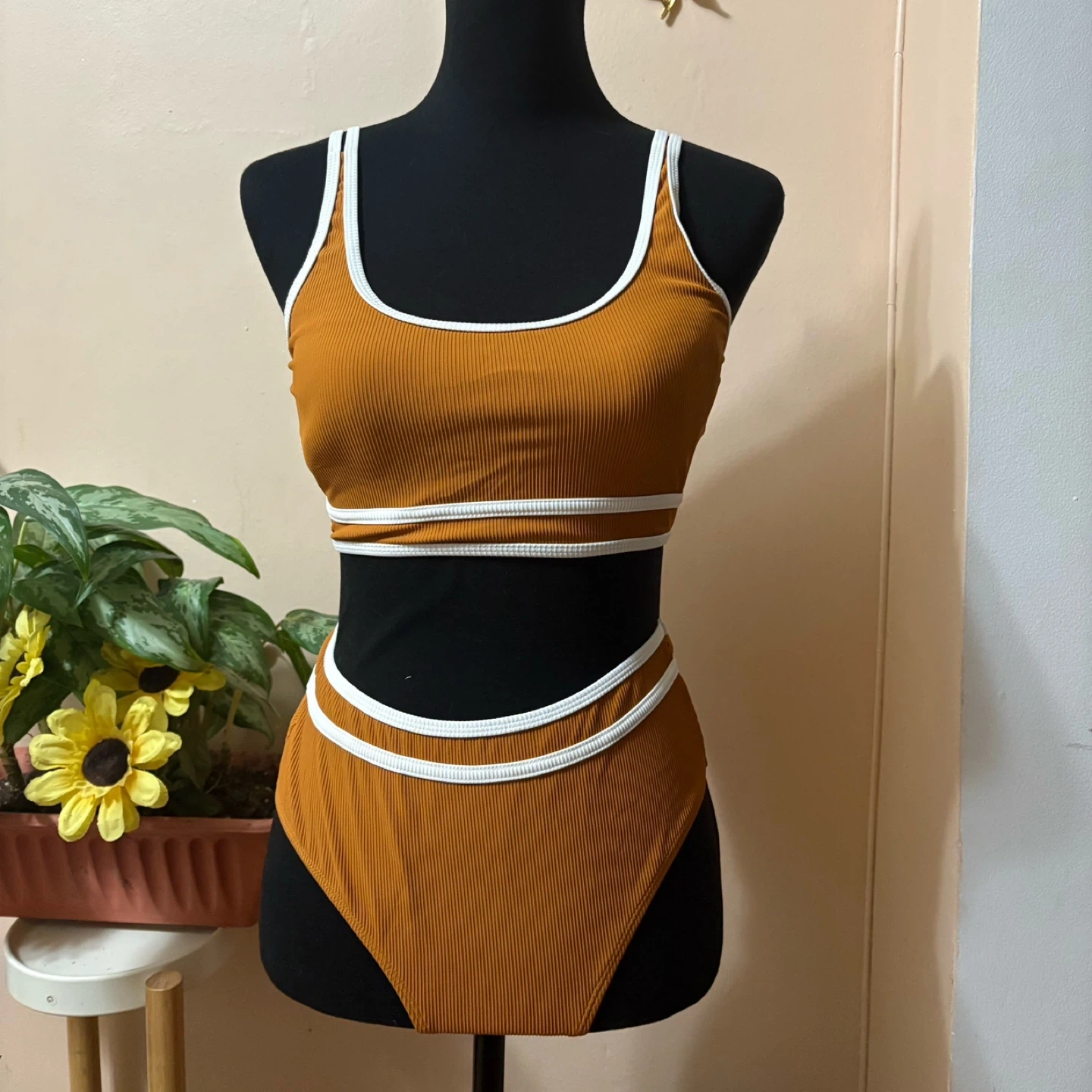 This AIMAGE bikini set comes in a ribbed fabric. It's a size small and features a stylish orange color with white trim. It's a two-piece swimsuit.