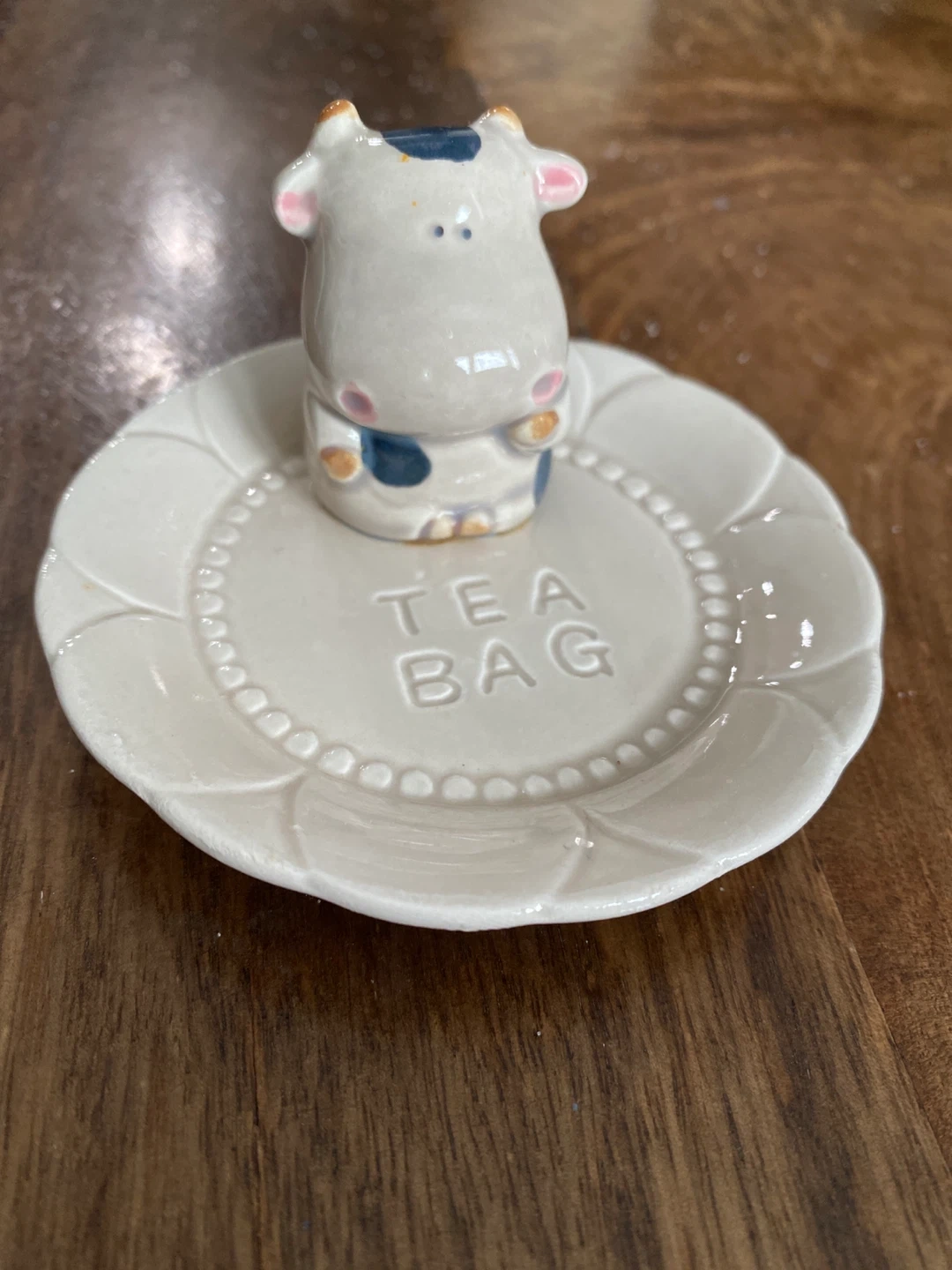 This cute ceramic dish is designed to hold your used tea bags. It features a little cow figurine on a small plate. Ceramic material.