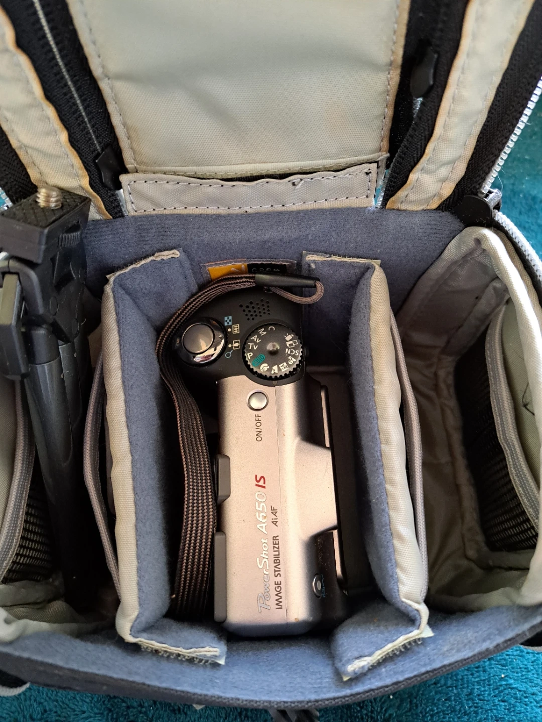 Canon PowerShot A650 IS digital camera with 12.1 megapixels and 6x optical zoom. Includes a Case Logic camera bag and a Targus mini tripod. The camera features image stabilization.