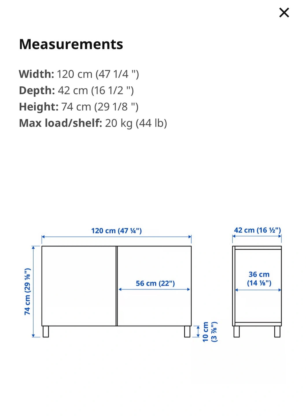 - Max load/shelf: 20 kg (44 lb)