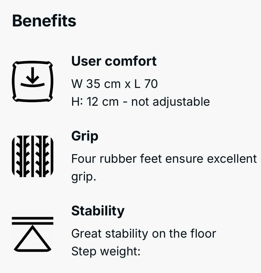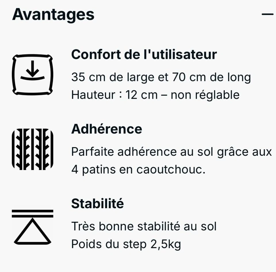 See picture for dimensions. This Step 100 Step Platform is designed for choreographed or functional step workouts that combine cardio and strength training. The compact Step 100 Step Platform is perfect for home workouts. Designed to grip the floor really well and remain in place for a great workout. Located in Montreal (Saint-Denis / Duluth).