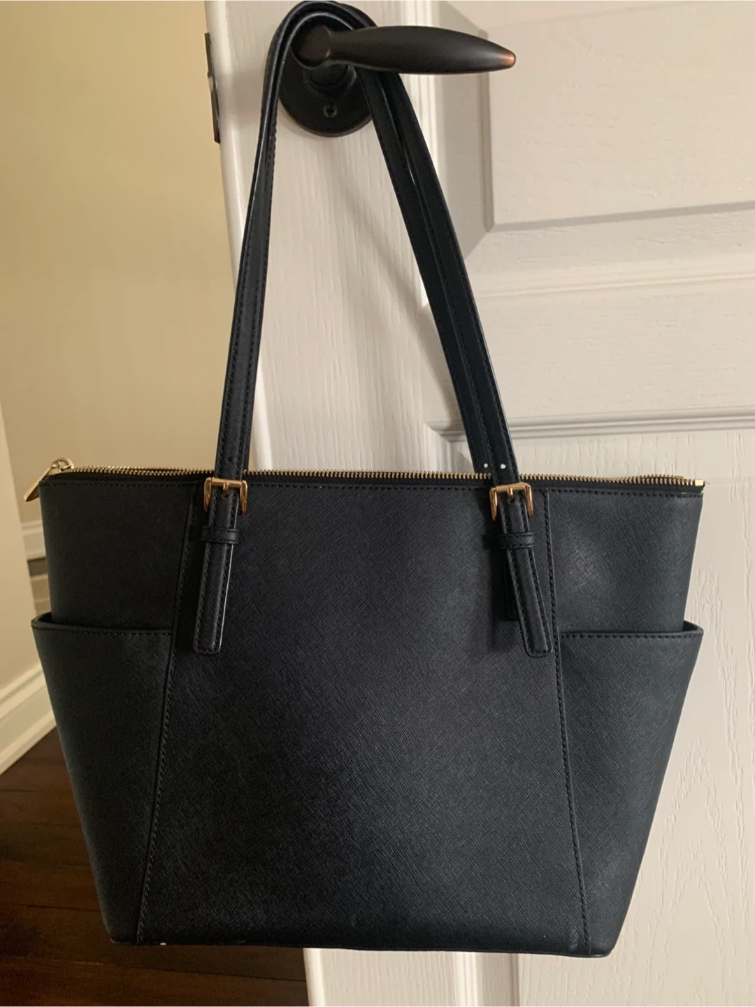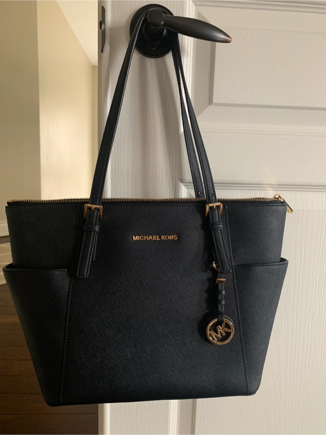 This is a black Michael Kors tote bag. It's made of saffiano leather. The bag has exterior side pockets and a zip closure. It's a great size for everyday use!
