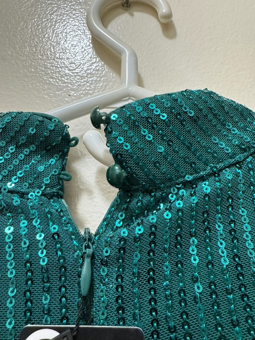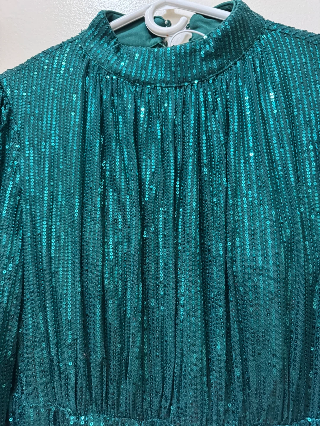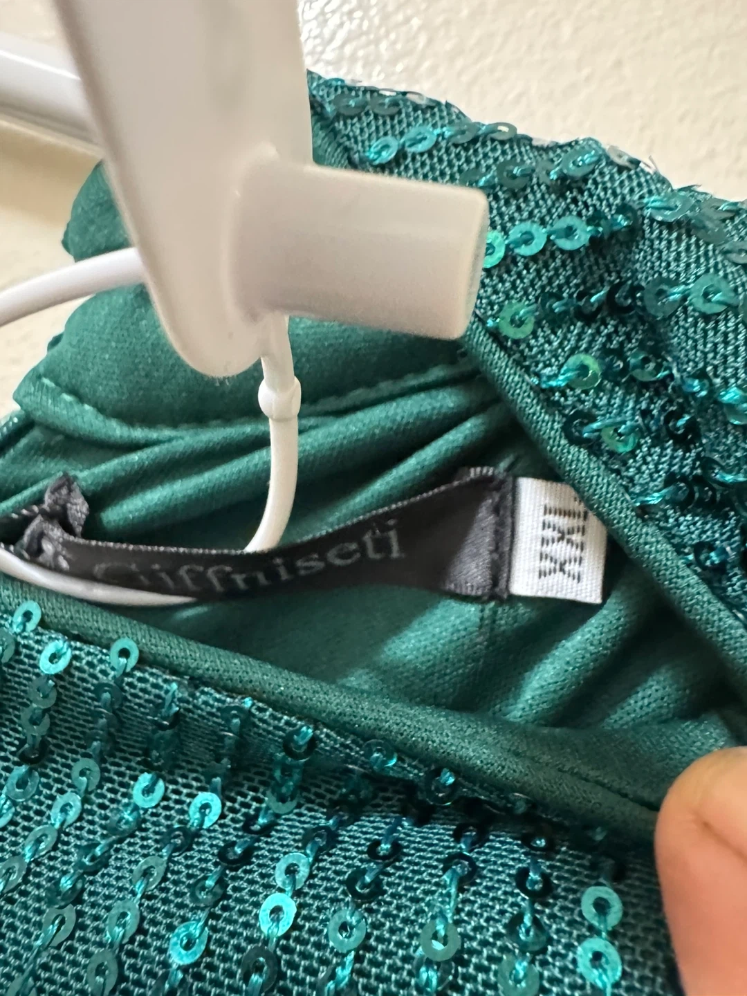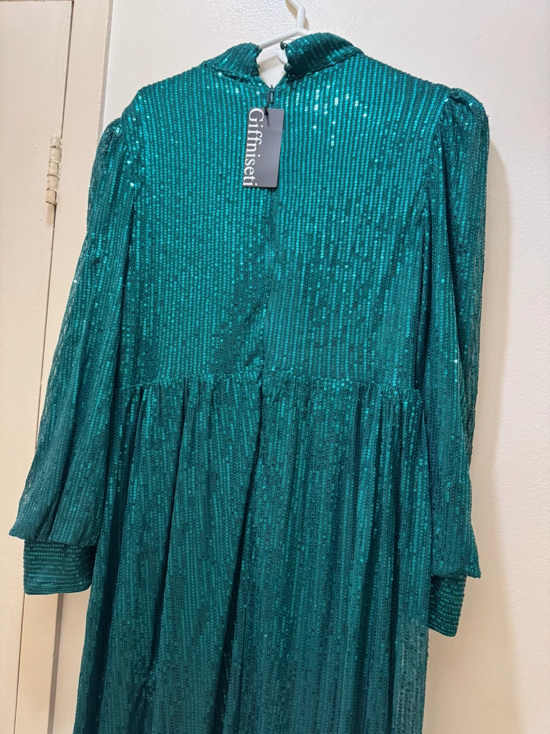 Selling a beautiful Giffniseti sequin dress in size XXL. The dress is a stunning green colour and features long sleeves and a belt. It's in great condition and ready for a new home! Washing instructions included: machine wash cold, do not bleach, warm iron, do not tumble dry, hang dry