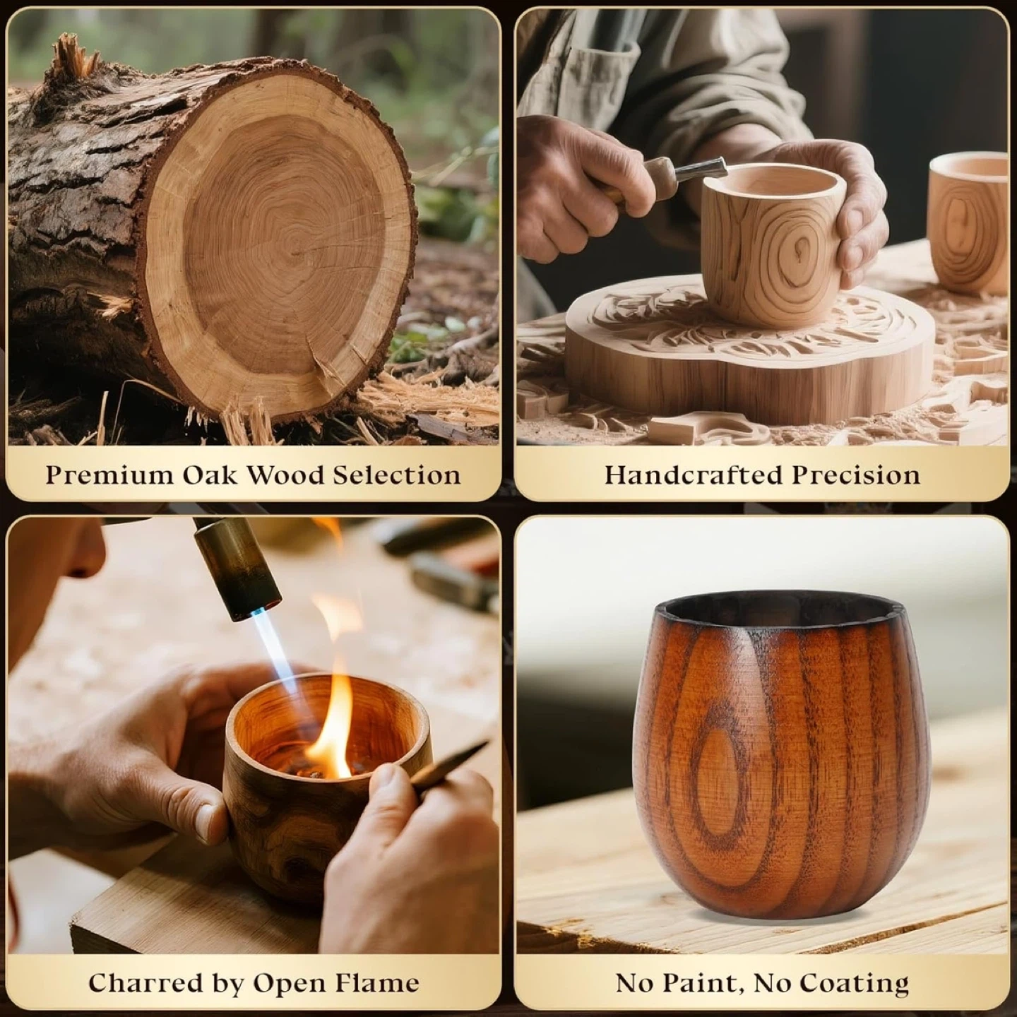 Elevate your drinking experience with this beautifully crafted jujube wood glass set, designed to enhance the natural flavors of whiskey, bourbon, beer, wine — and even hot beverages like coffee or tea. The interior is carefully carbonized (charred), adding a subtle smoky richness reminiscent of aged oak barrels.
