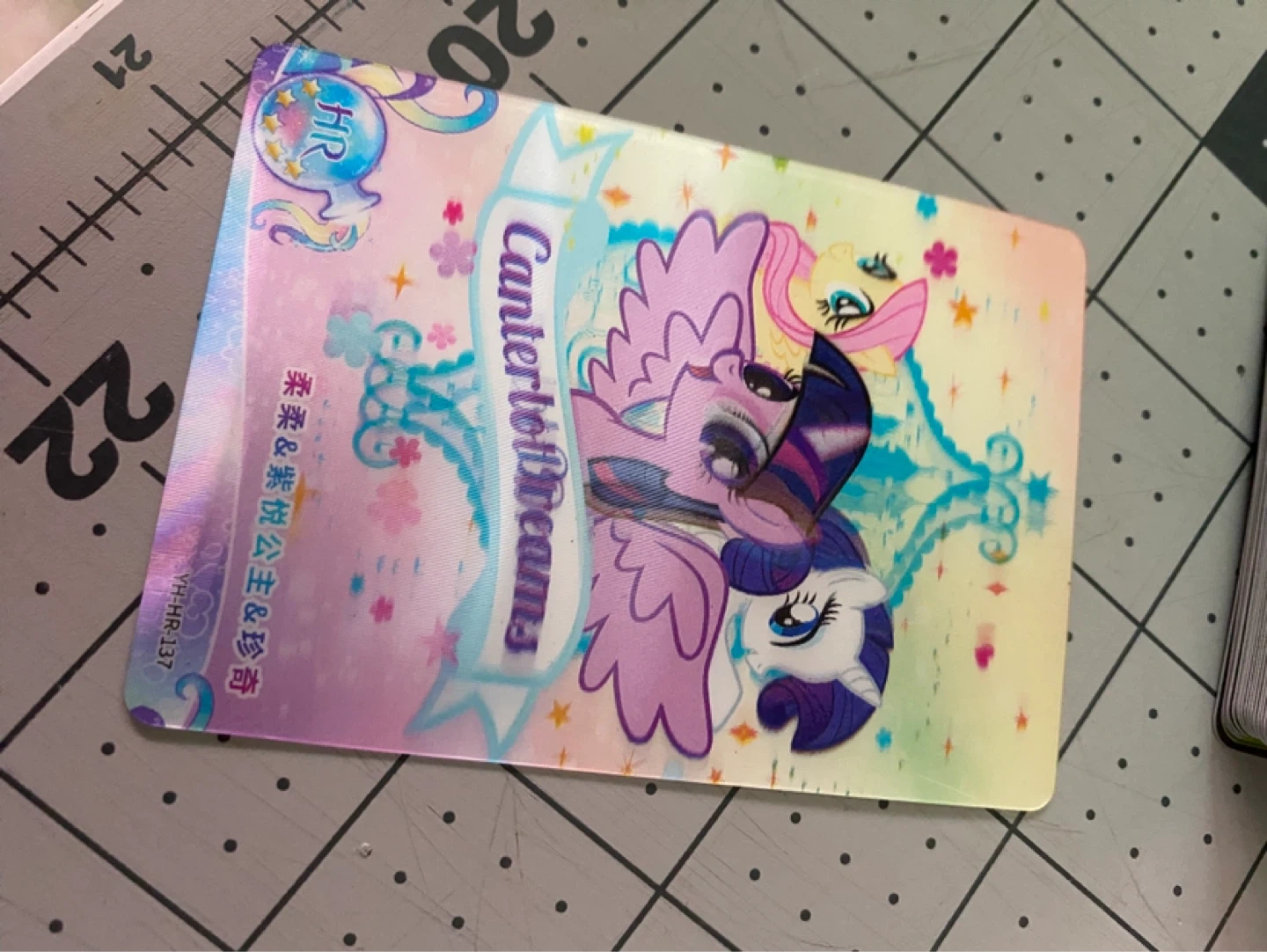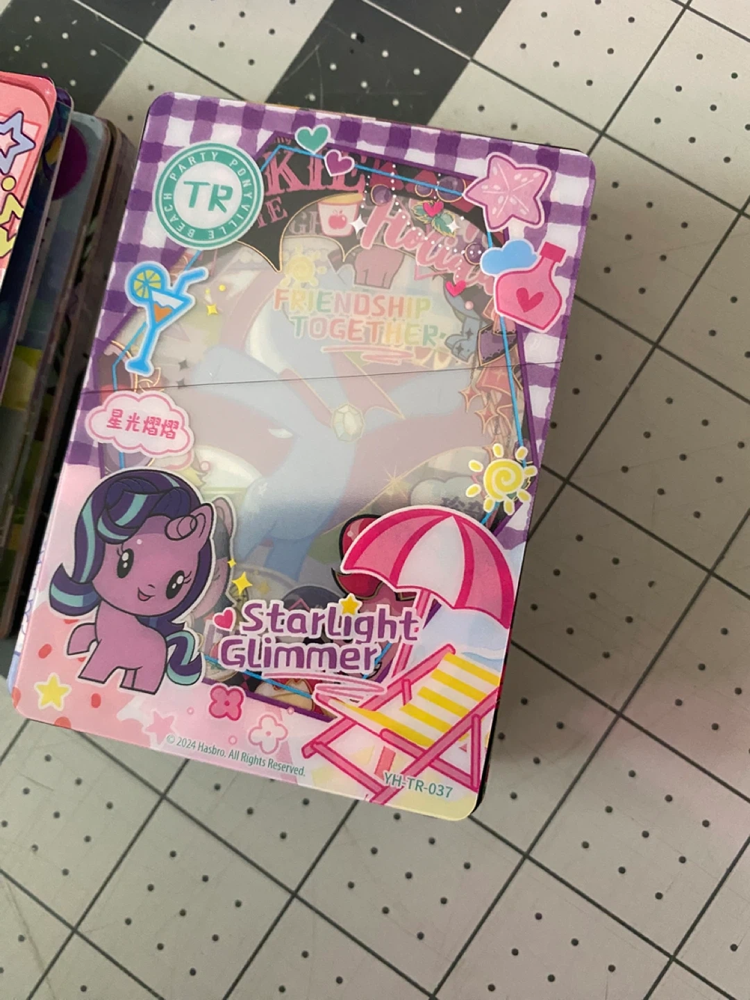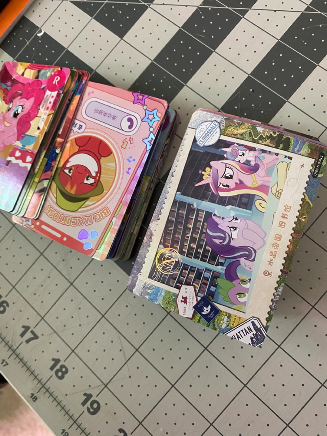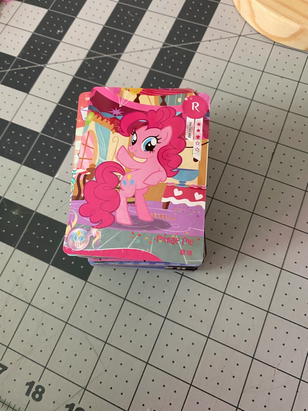 A stack of My Little Pony collectible cards featuring various characters. These cards are great for fans and collectors. Made by Hasbro.
