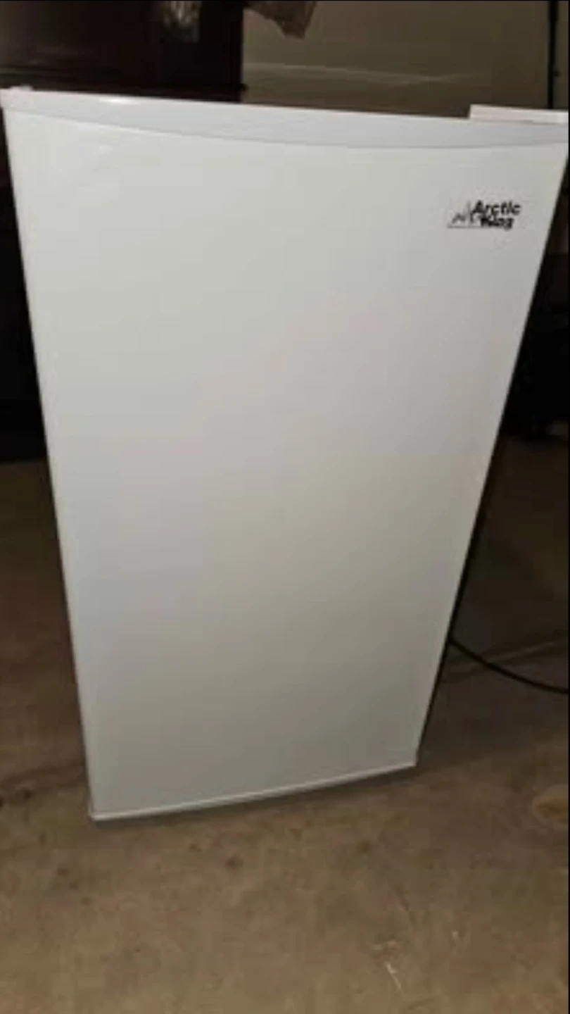 This is an Arctic King mini fridge. It's white and features multiple shelves and door bins for storage. Perfect for a dorm room or small apartment!