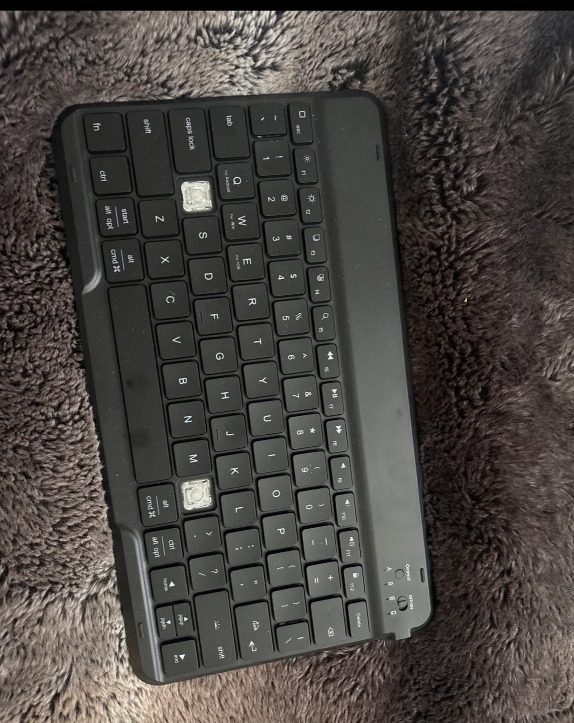 This is a black portable Bluetooth keyboard. It's designed for use with Android, Windows, and iOS devices. Two keys are missing, but still work when you press them indicated in the photos.
