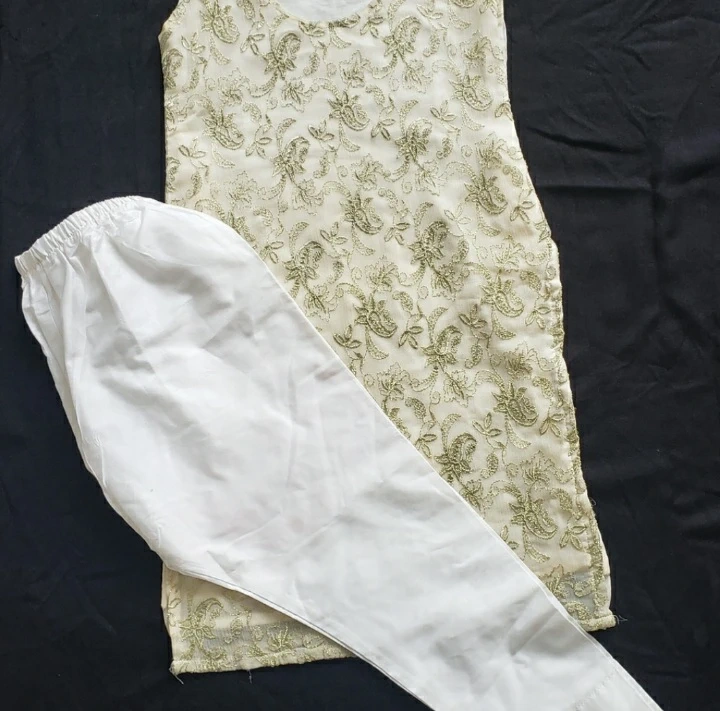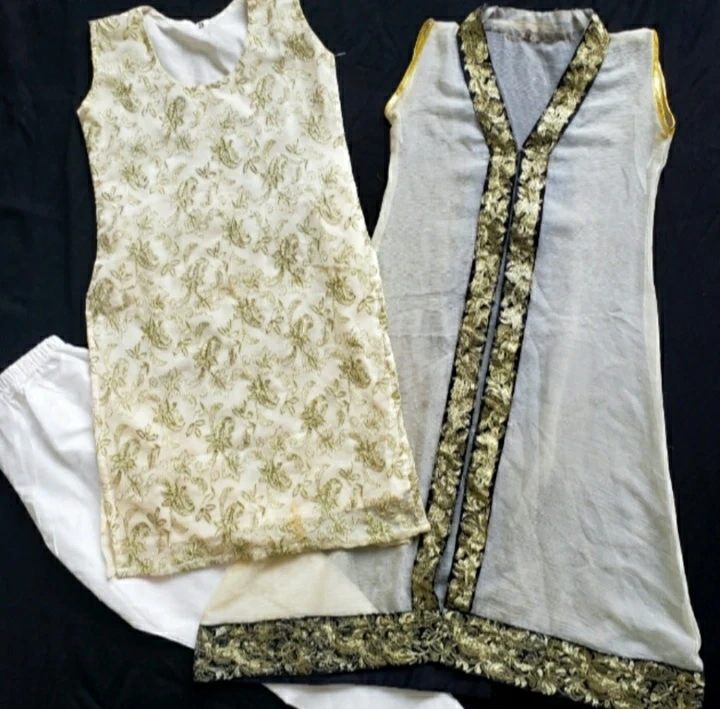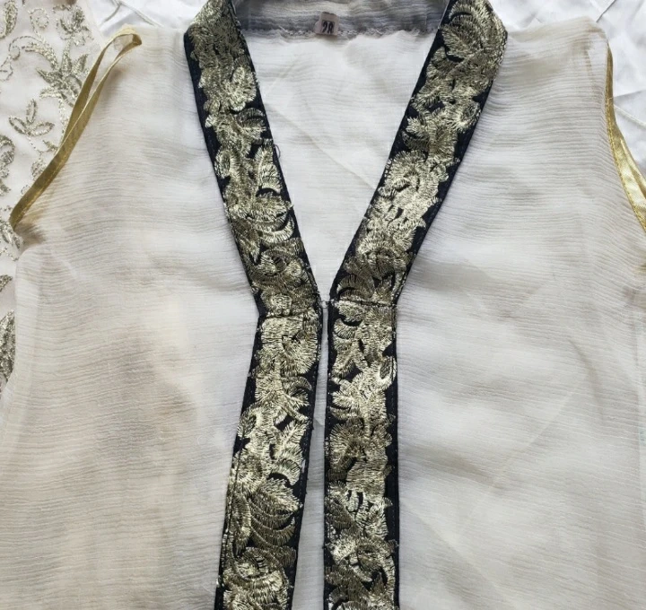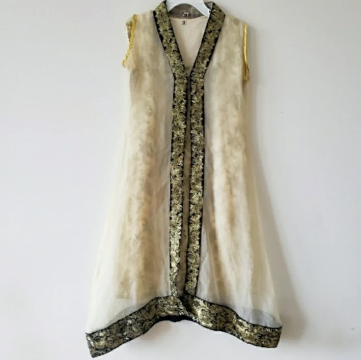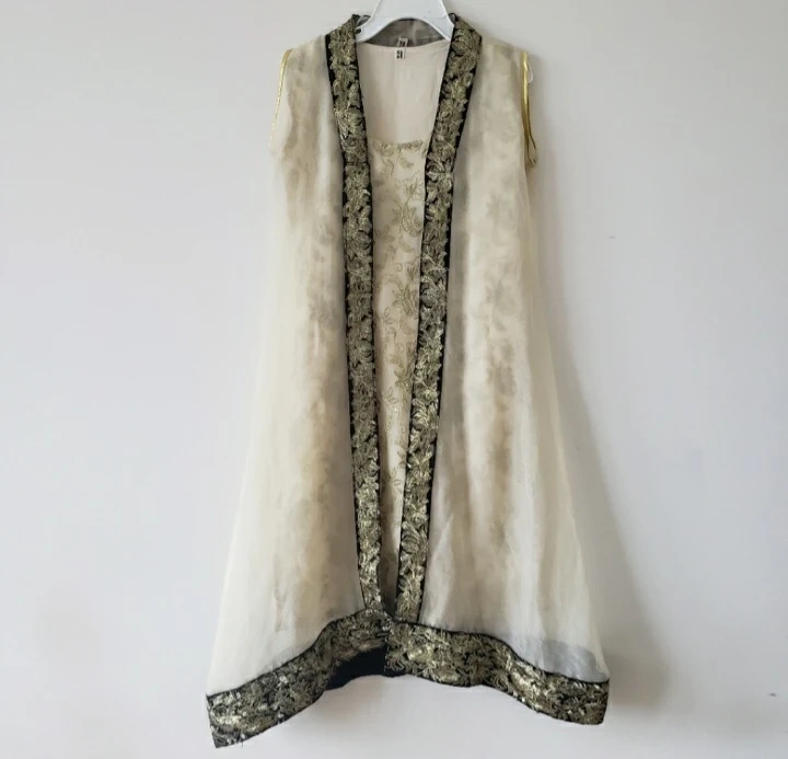 Fancy gown style dress with golden embroidery on the front and bottom. Only used once or twice, is in great condition. Trouser is new.