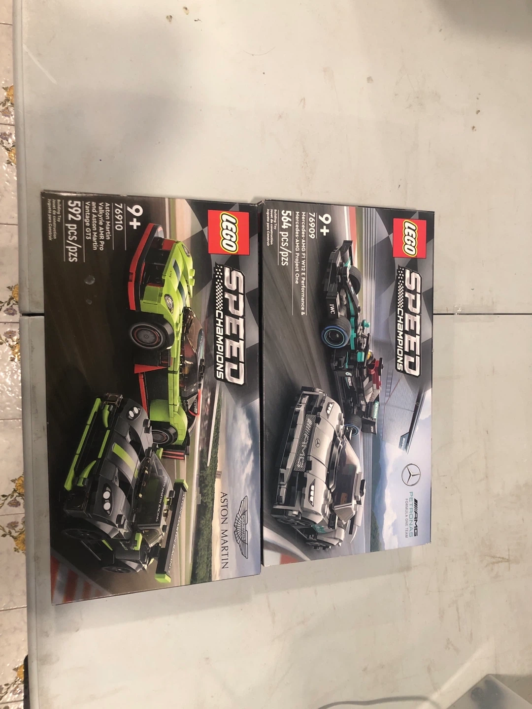 Two LEGO Speed Champions sets: the Aston Martin Valkyrie AMR Pro and Vantage GT3 (76910) with 592 pieces, and the Mercedes-AMG F1 W12 E Performance & Project One (76909) with 564 pieces. Both are recommended for ages 9+. Some pieces are missing from both sets but each one is $75
