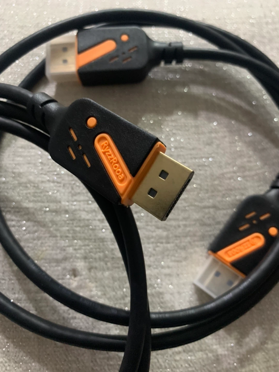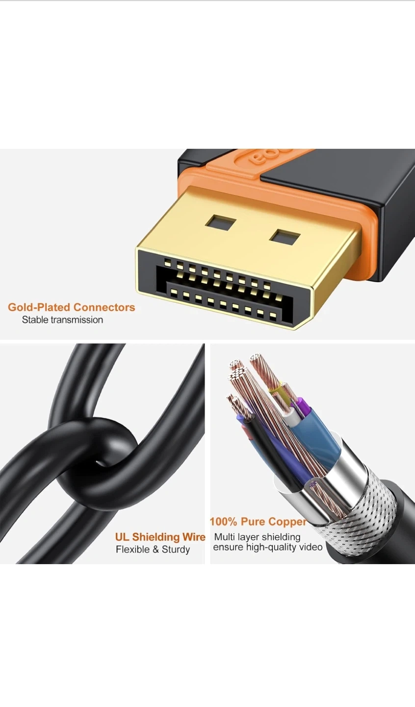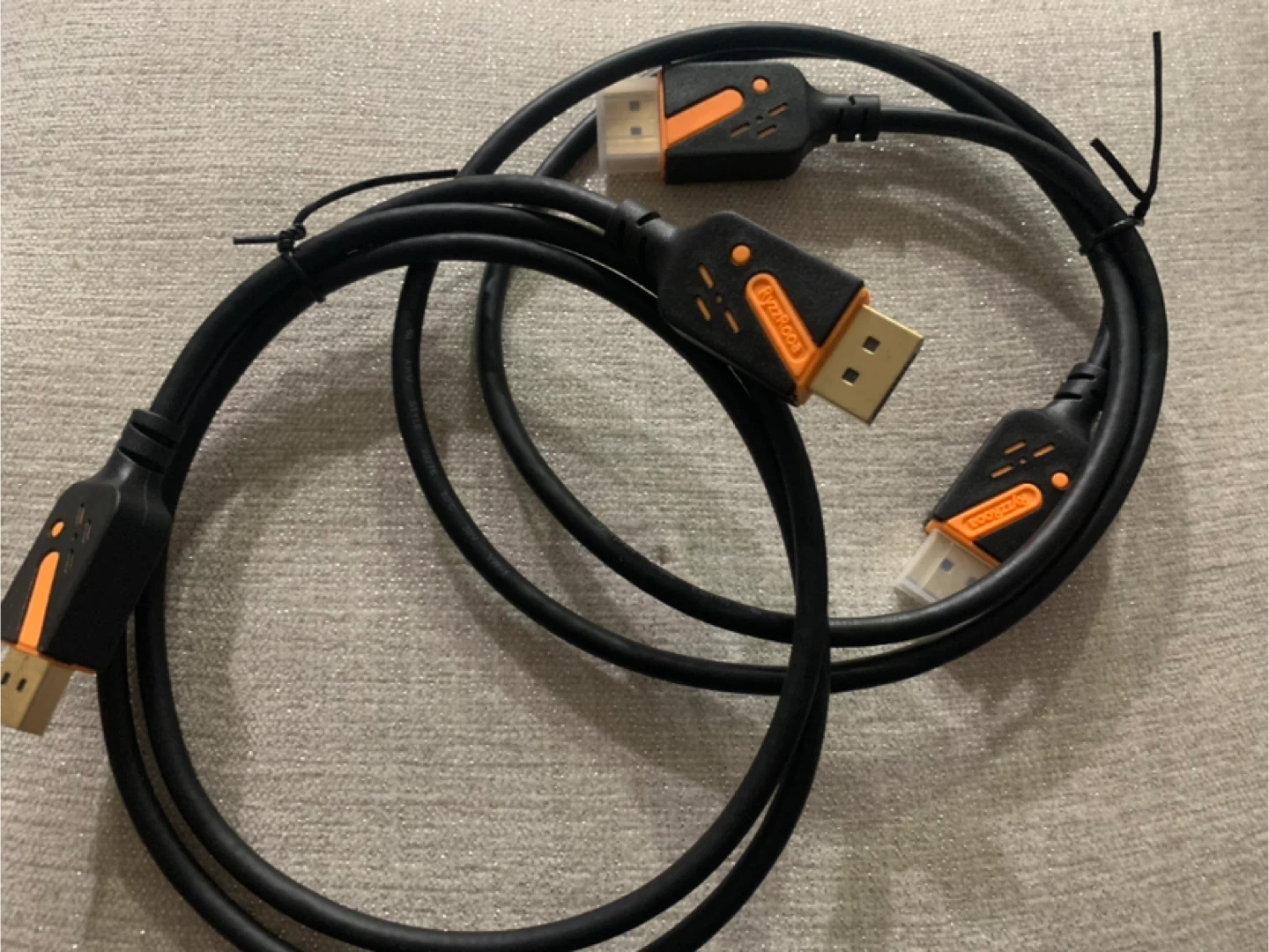 These are two black DisplayPort 1.2 cables. They support 4K resolution at 60Hz with a bandwidth of 21.6Gbps. Features gold-plated connectors for a secure connection. Perfect for connecting your monitor or display to a graphics card or computer!