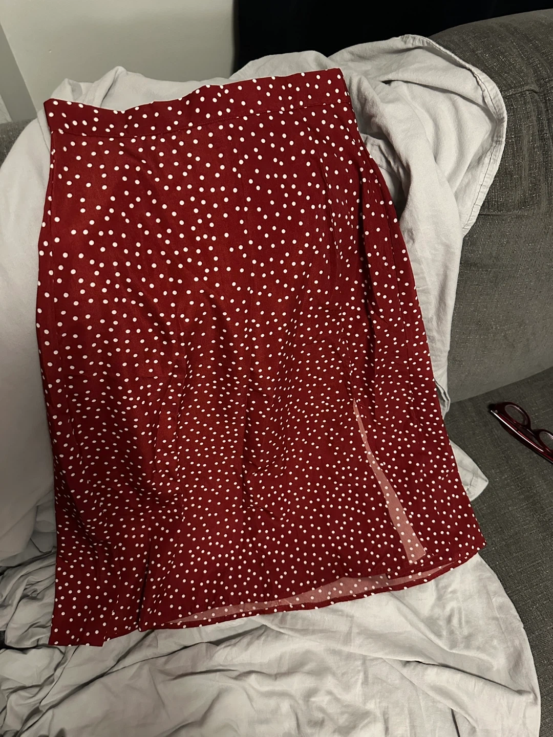 This maroon skirt has a white polka dot pattern. It's a knee-length style with a side slit for added detail.