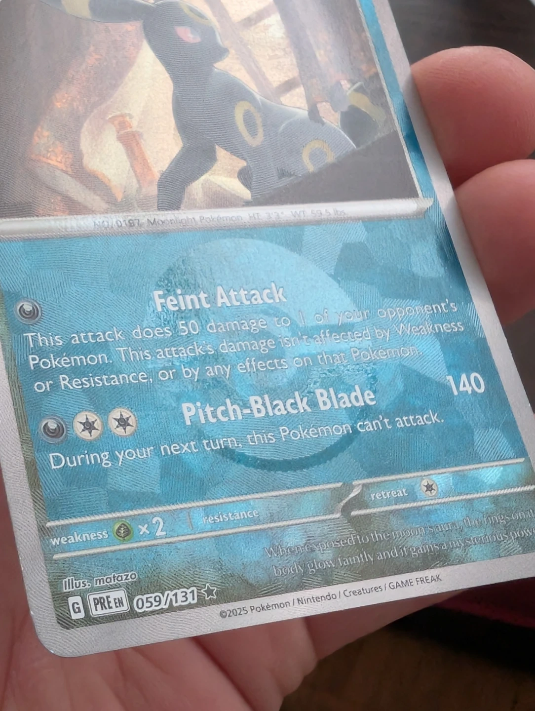 This is a Pokemon Trading Card featuring Umbreon. It's card number 059/131 from Prismatic Evolutions. Masterball edition card