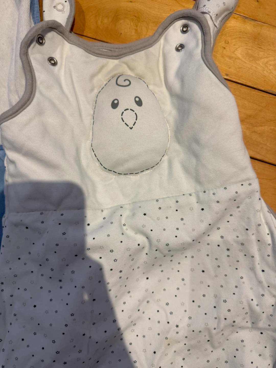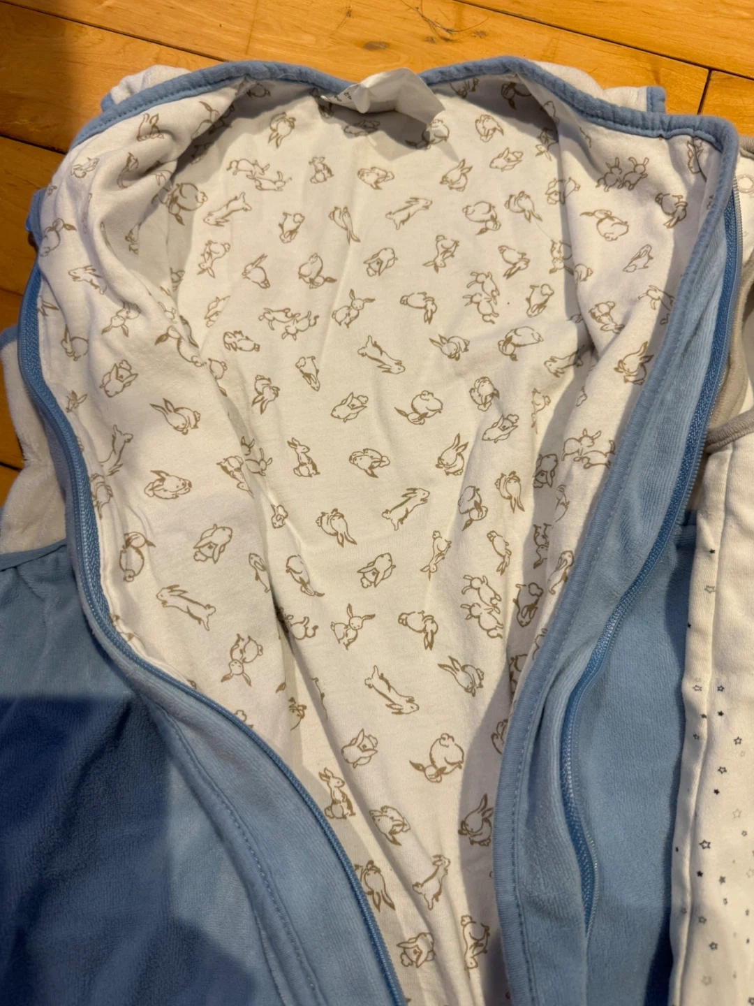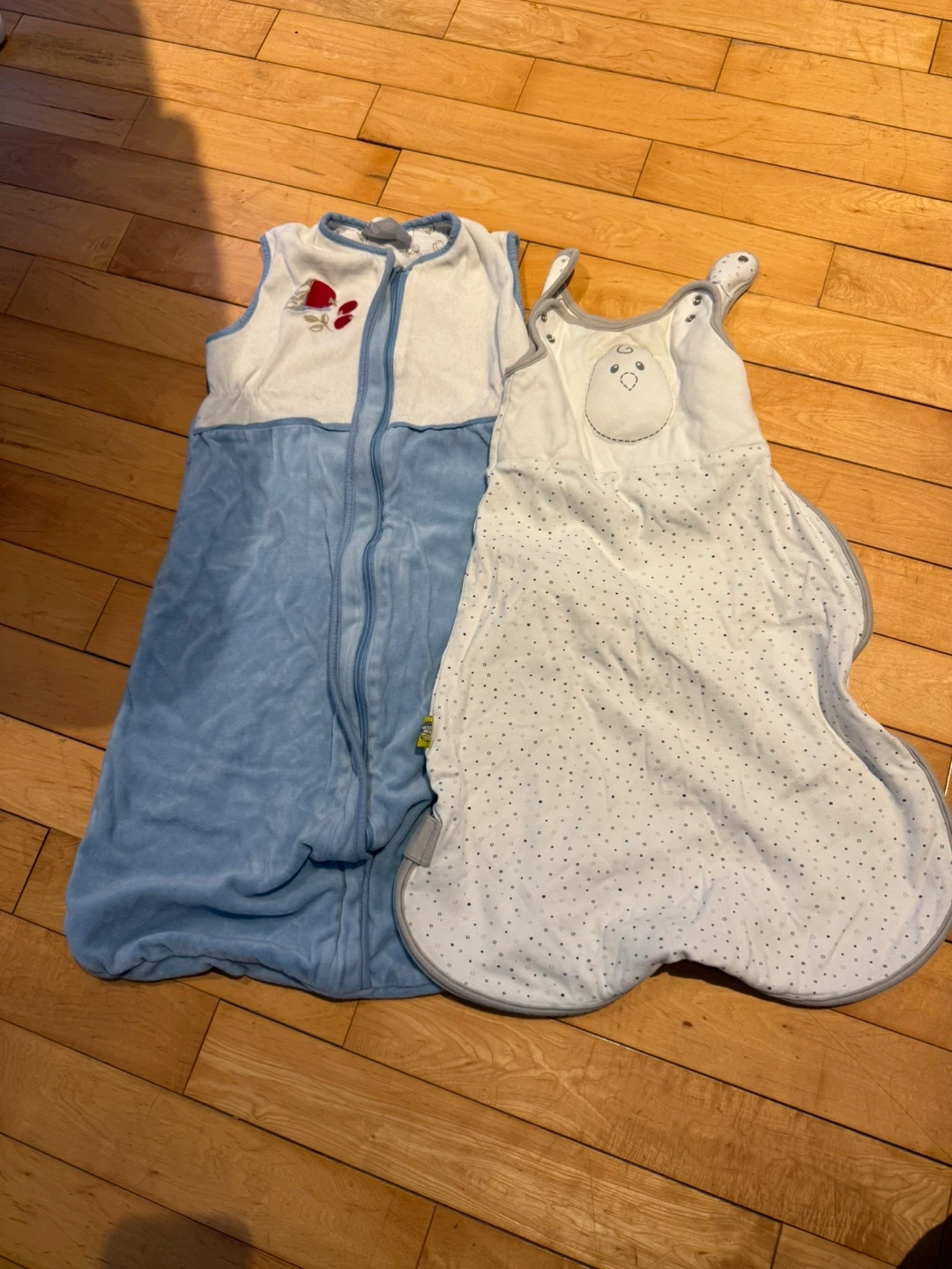 Two baby sleep sacks for keeping your little one cozy. One is blue with a bunny embroidery and a white top. The other is white with a chick appliqué and a grey trim. Both feature adorable printed linings. 6-18m