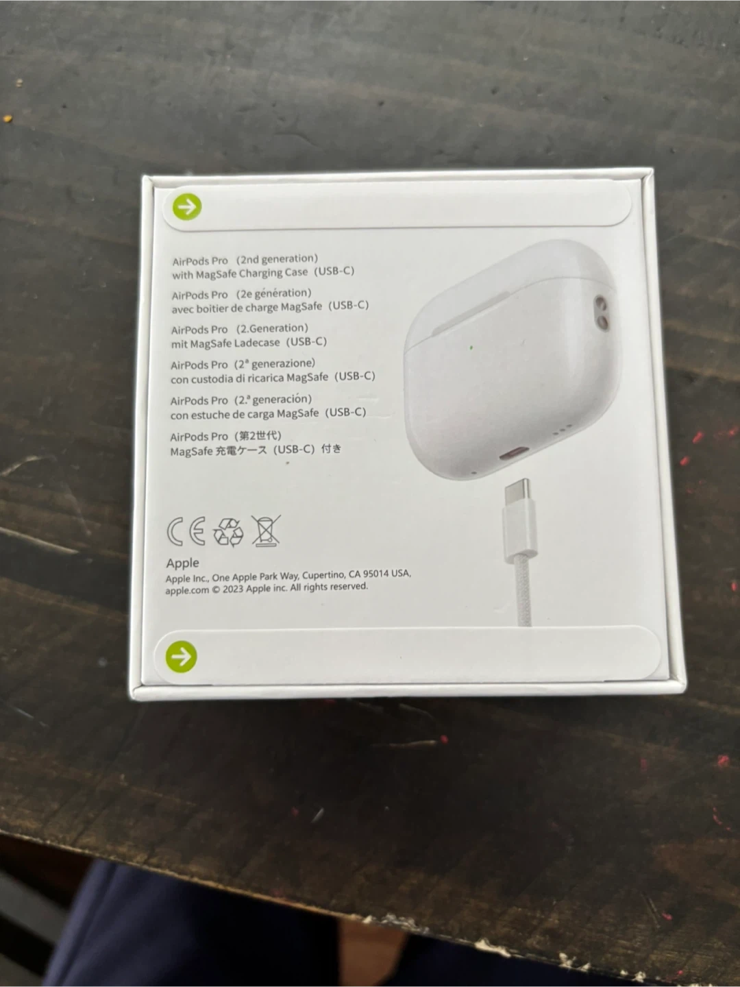 Apple AirPods Pro (2nd generation) with MagSafe Charging Case. Includes USB-C charging cable. Designed by Apple in California.