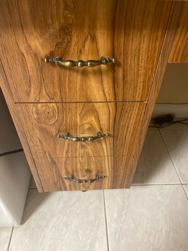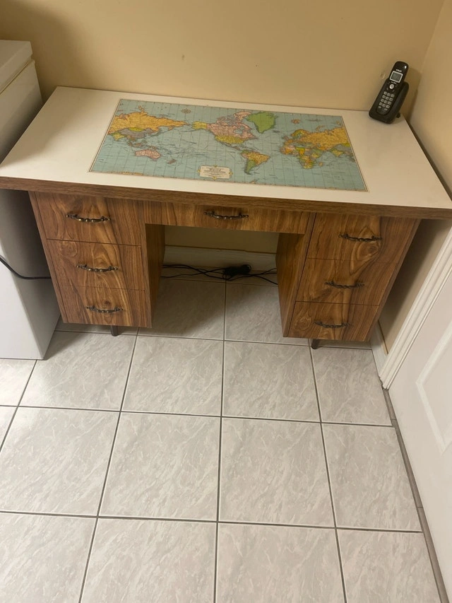 This used desk features a unique world map inlay on its surface, making it a functional and decorative piece. It is used, but still in good condition. It includes drawers on either side offering great storage! I estimate the value to be $150 based on Kijiji pricing of similar items. If the ad is up, it is available! Perfect for a student or anyone who appreciates craftsmanship. Cash accepted.
