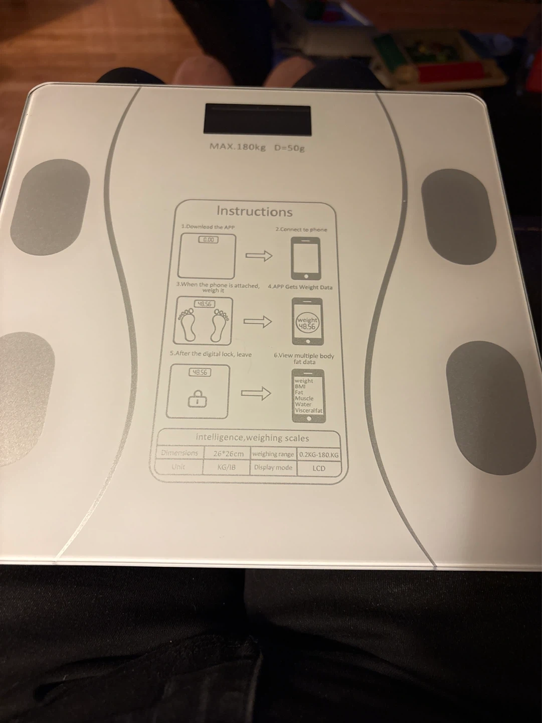 OKOK Bluetooth smart scale with a weighing capacity of up to 180kg and a precision of 50g. It connects to your phone via Bluetooth to sync your body fat data. Dimensions are 26x26cm….