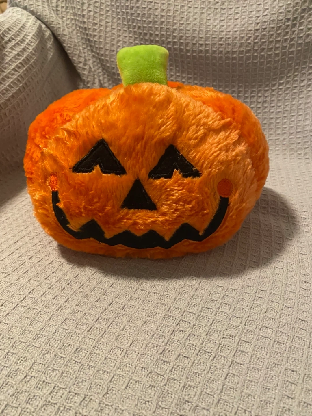 Super soft and cuddly plush pumpkin decoration. It's got a fuzzy orange exterior with a friendly jack-o'-lantern face. Perfect for adding some spooky charm to your Halloween decor!
