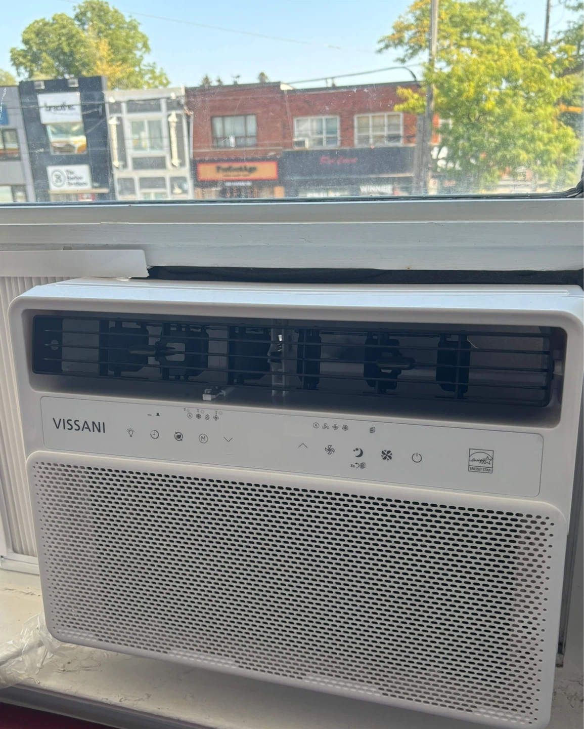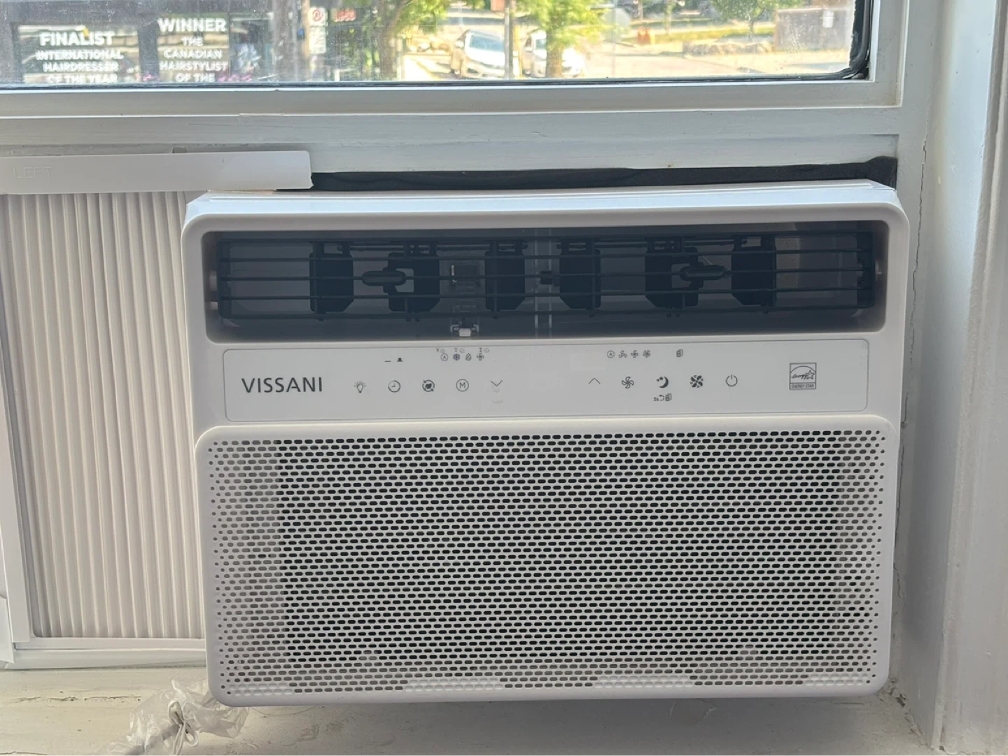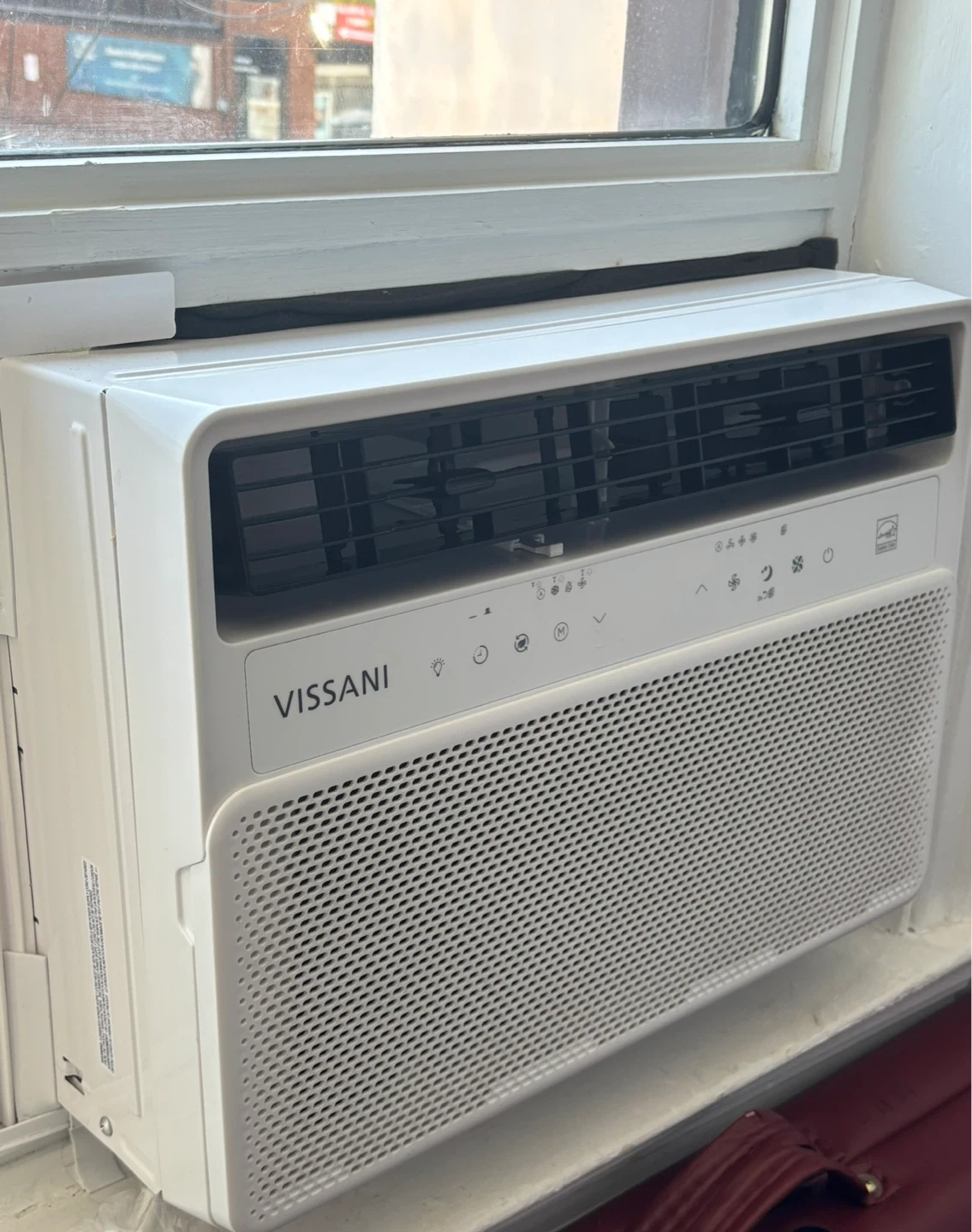 Vissani 700 sq ft window air conditioner with 14000 BTU/h. It features 3-in-1 climate regulation: cool, dehumidify, and circulate. Easy and fast installation. Inverter technology for consistent temperature. Unit dimensions are 55.1 cm x 48.2 cm x 37.3 cm.