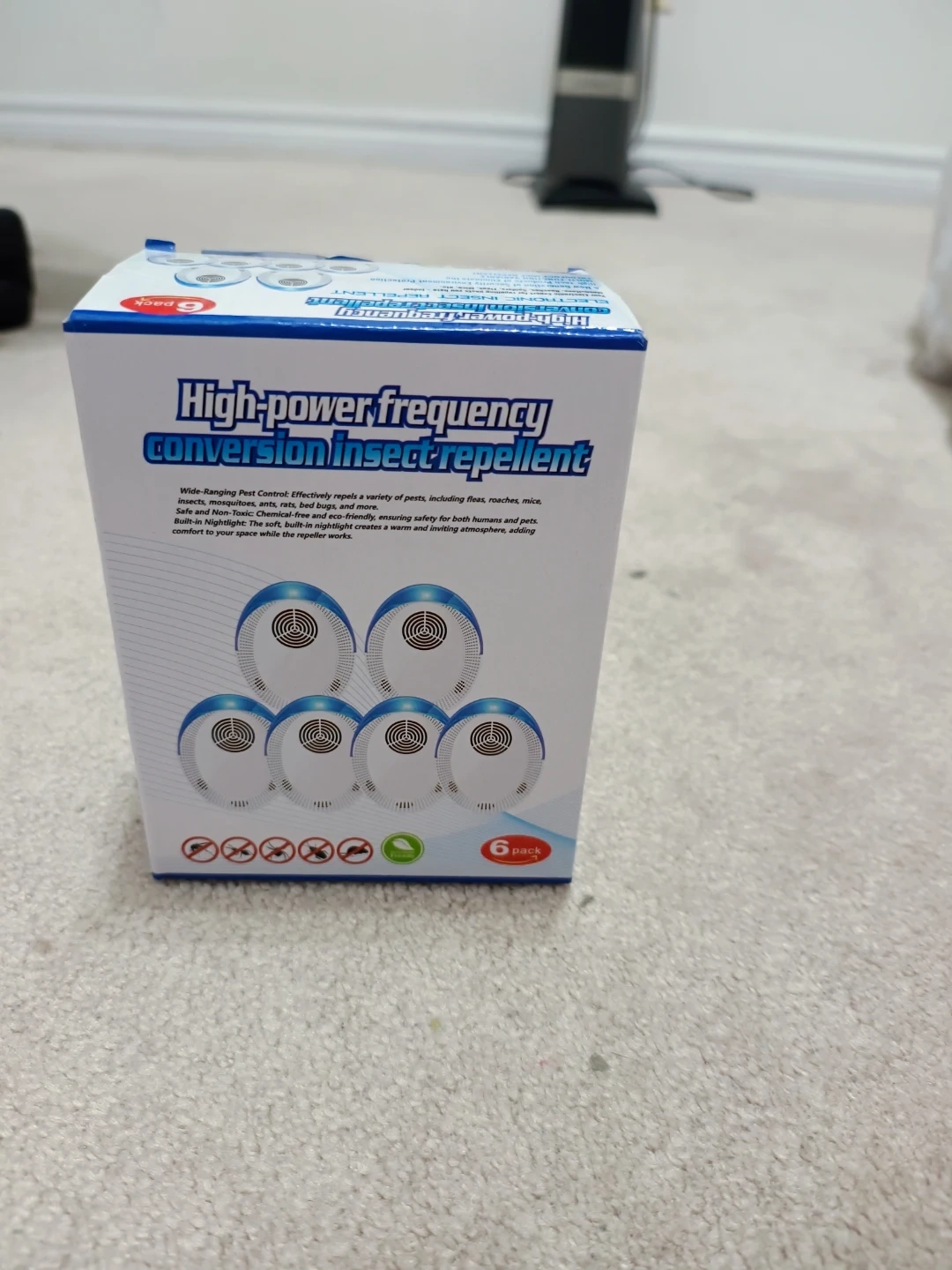 This is a 6-pack of high-power frequency conversion insect repellents. It's designed to repel a variety of pests including flies, mosquitoes, mice, and roaches. It's safe and non-toxic, chemical-free, and eco-friendly, making it safe for both humans and pets. This device creates a warm and inviting atmosphere while effectively keeping pests away.