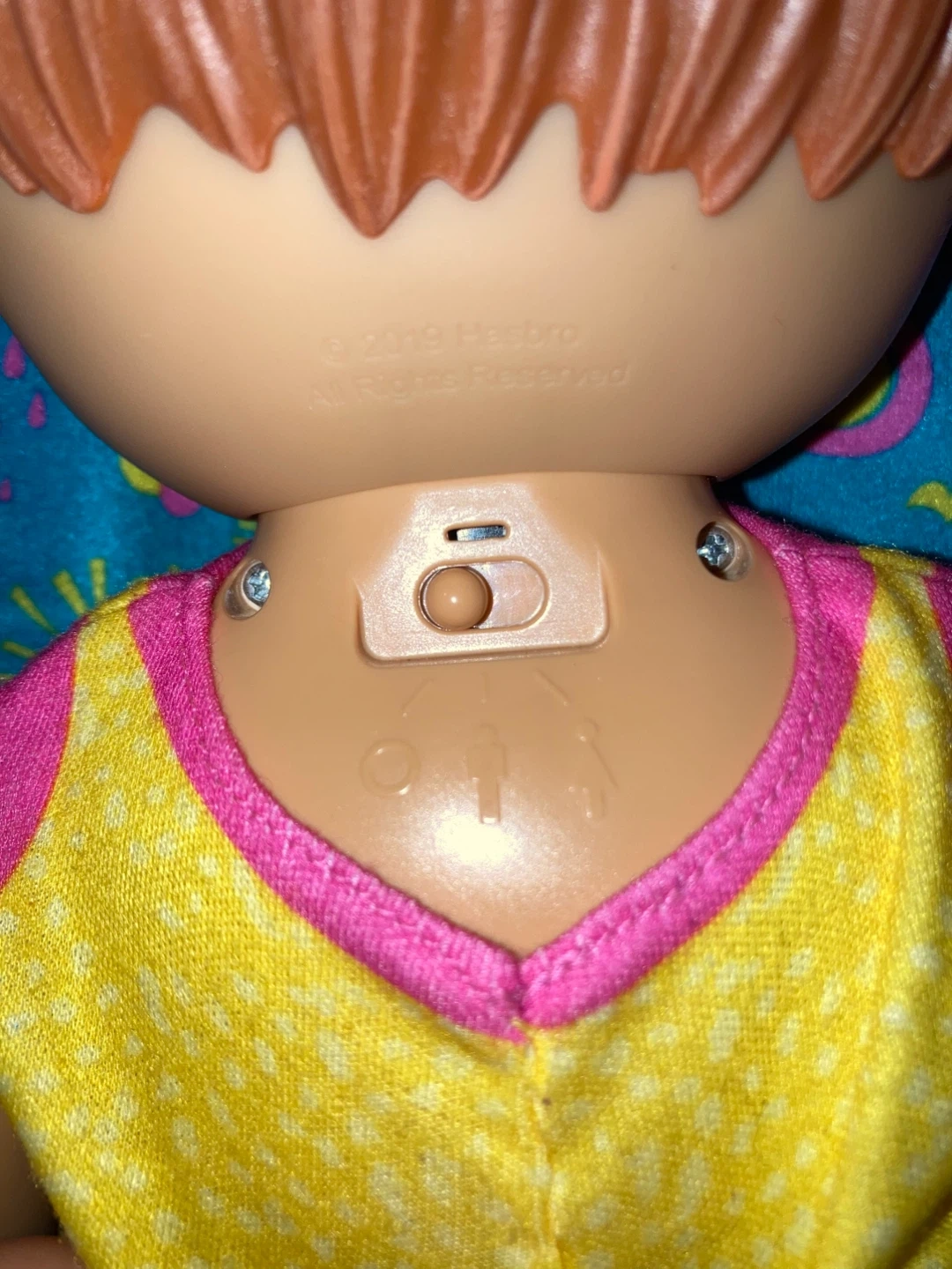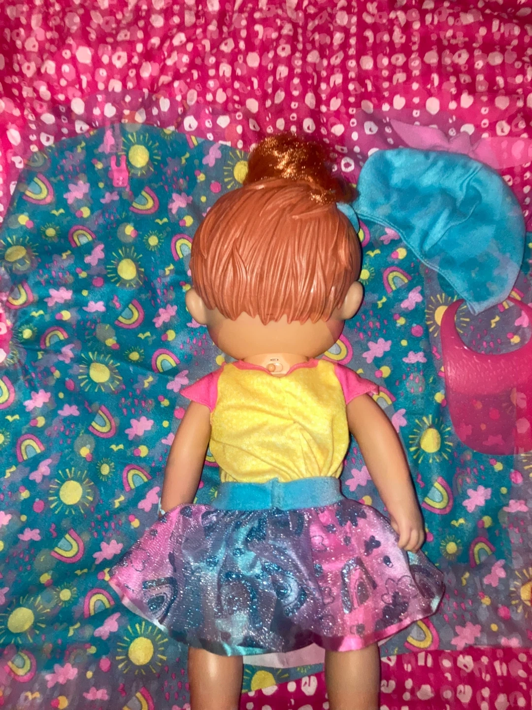 This Baby Alive doll has a colourful outfit. It comes with a blue toque and a pink bib with a baby swaddle. The doll has a switch on its back for sound features. Hair grows and grows when taken fed and played with.