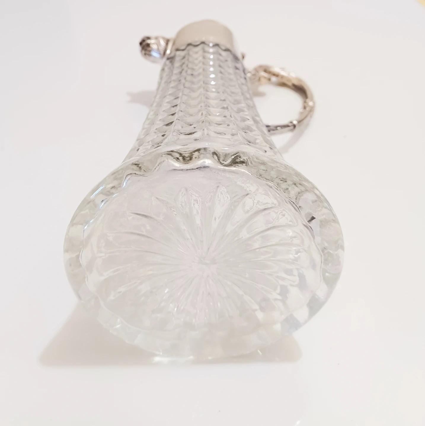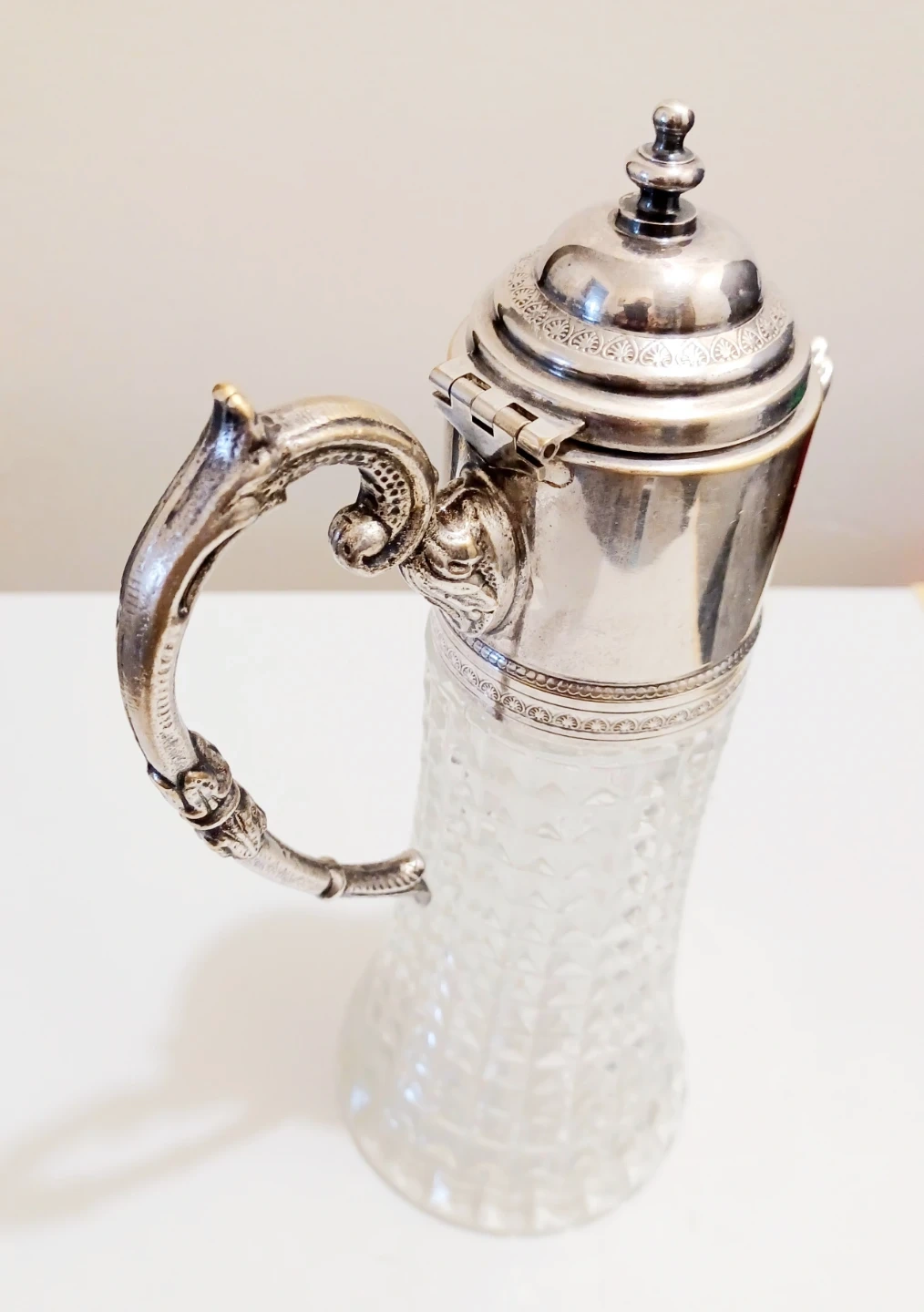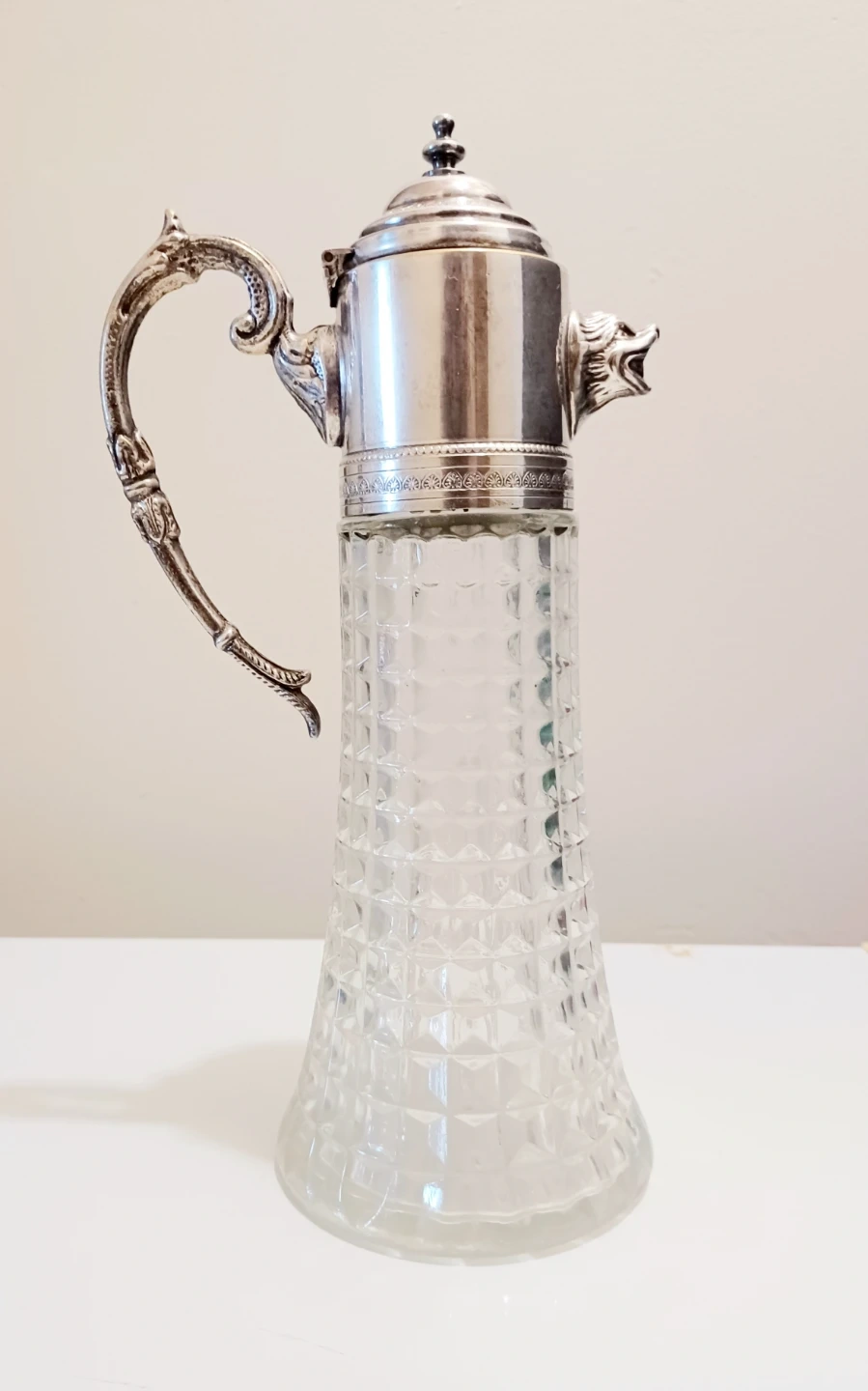 Antique, Stunning Claret Jug, originating from Italy during the 1880s, featuring a crystal body and silver-plated mounts, adorned with intricate decorative and Hand Cut Diamond Point Crystal Glass ArtvDecanter . Silver-plated top, lid, and decorative handle.