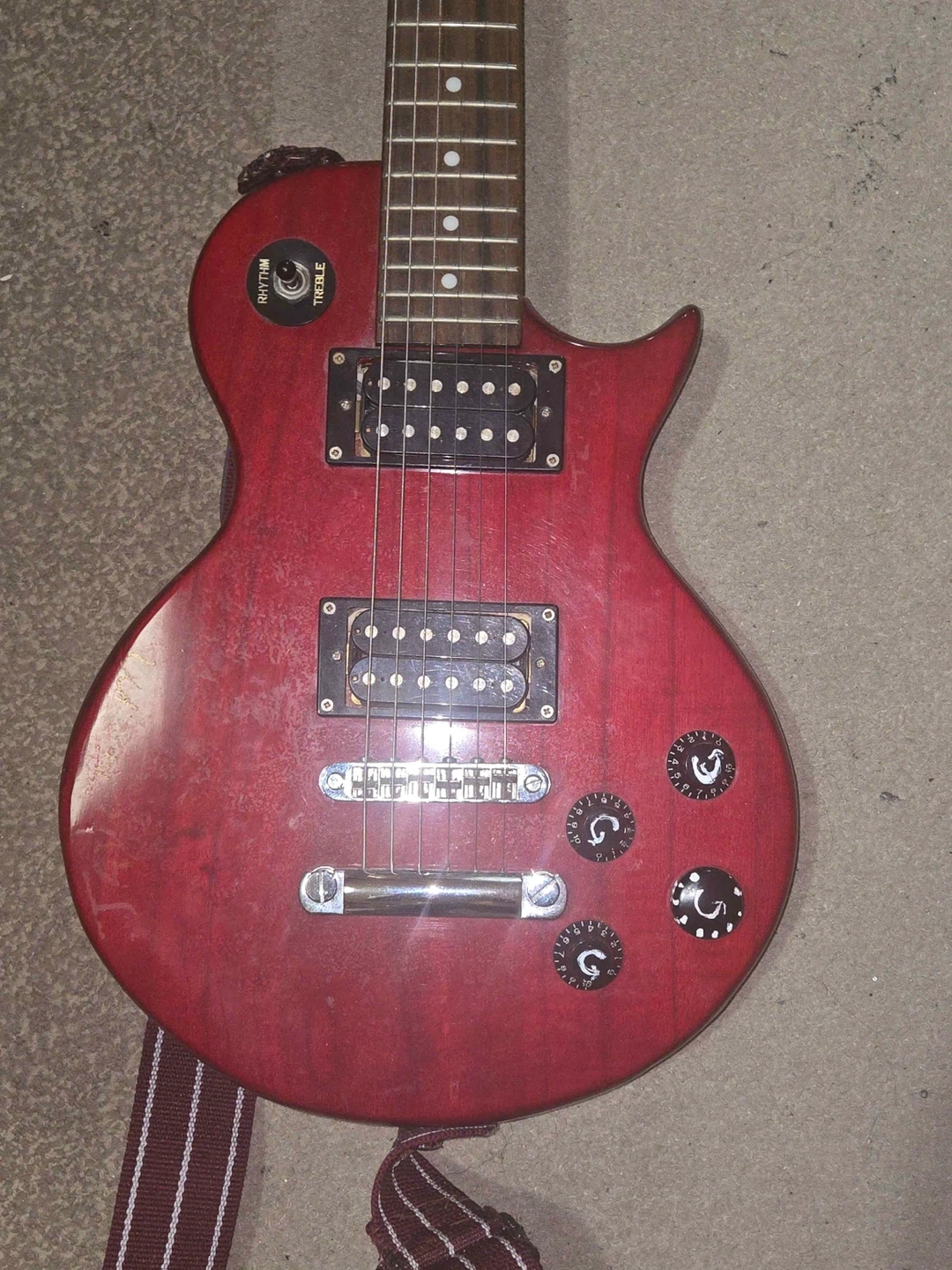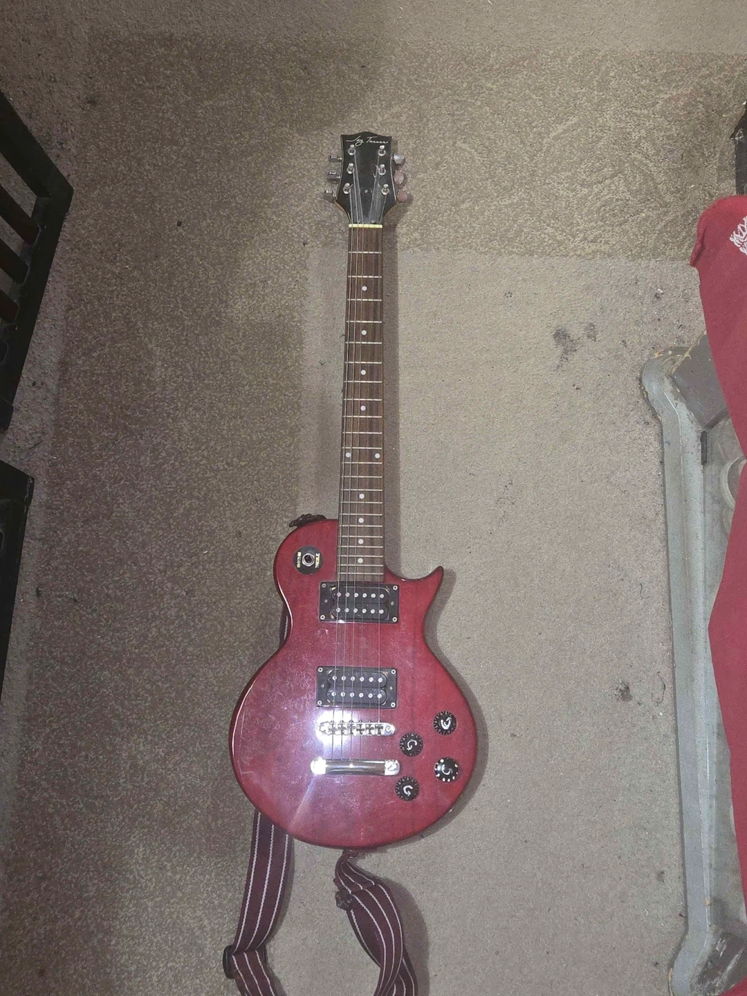 This is a red electric guitar from Jay Turser. It's a solid body guitar with a classic design. It has two pickups and standard volume and tone controls.
