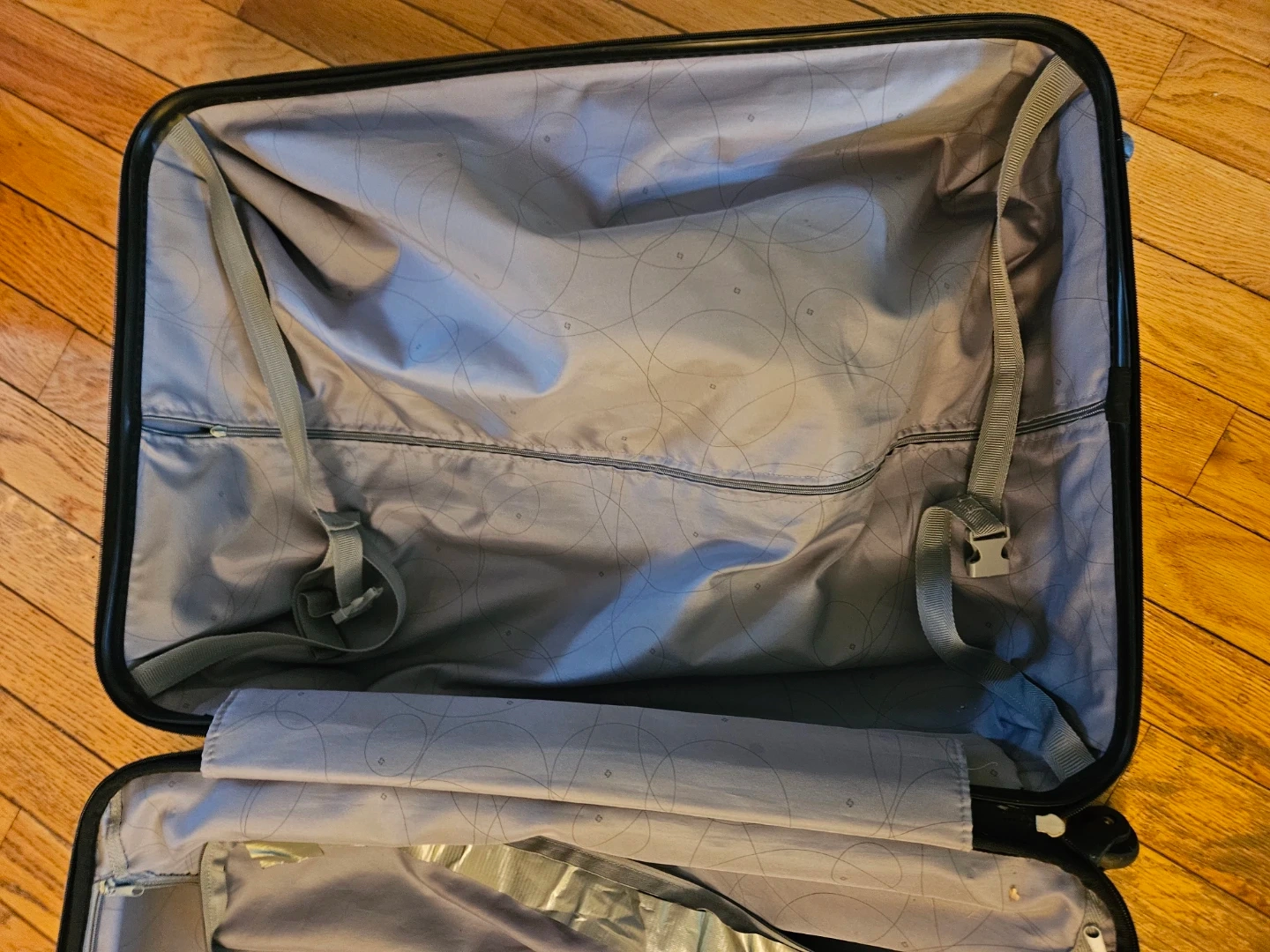 This is a Samsonite hard-shell suitcase. It has a patterned exterior and a fabric interior with tie-down straps. It is large and suitable only for checked baggage. Approx 12 x 19 x 30in