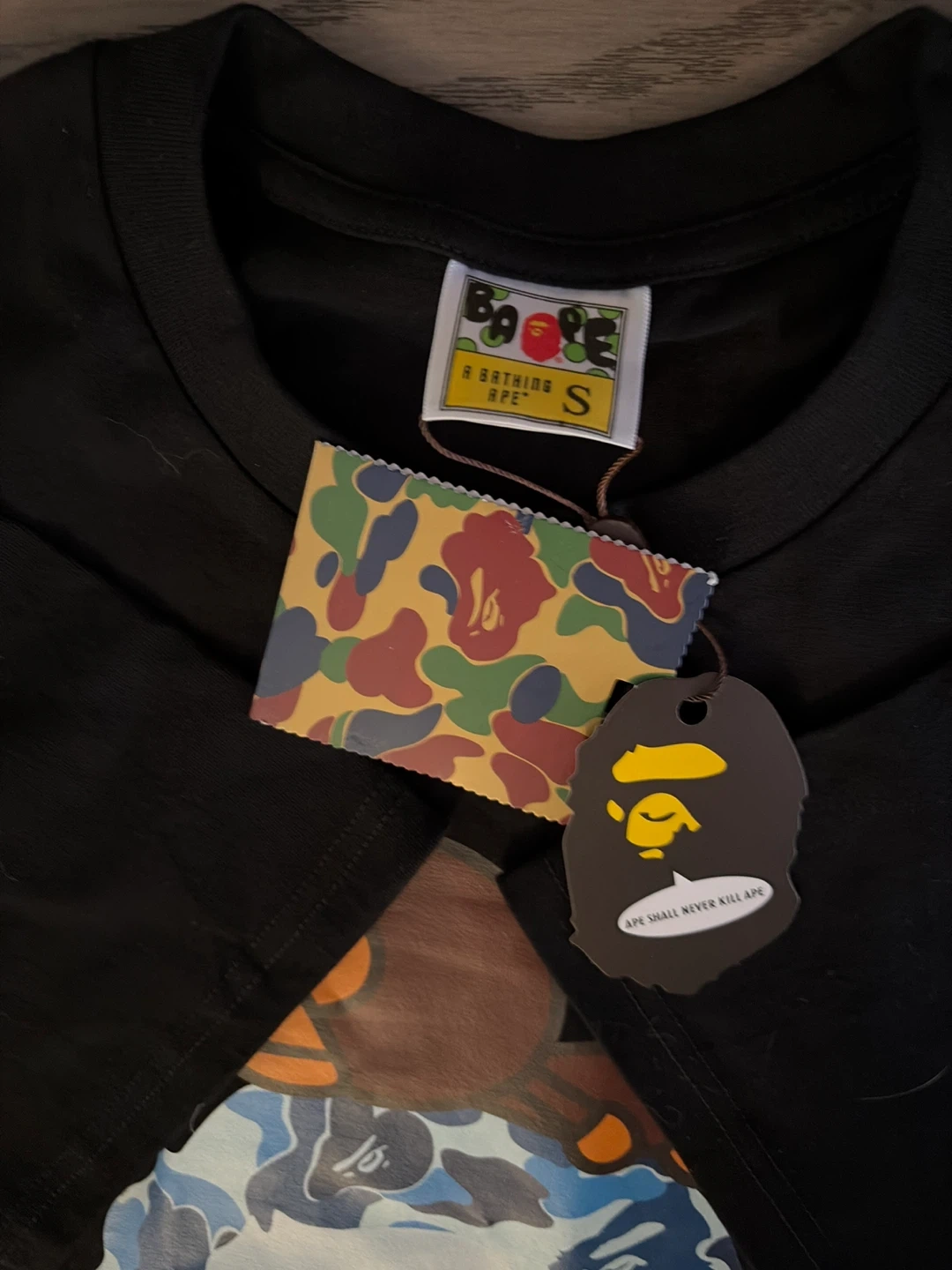 A Bathing Ape black t-shirt featuring the signature blue camo print. It's a size small. This tee comes with its original tags attached.