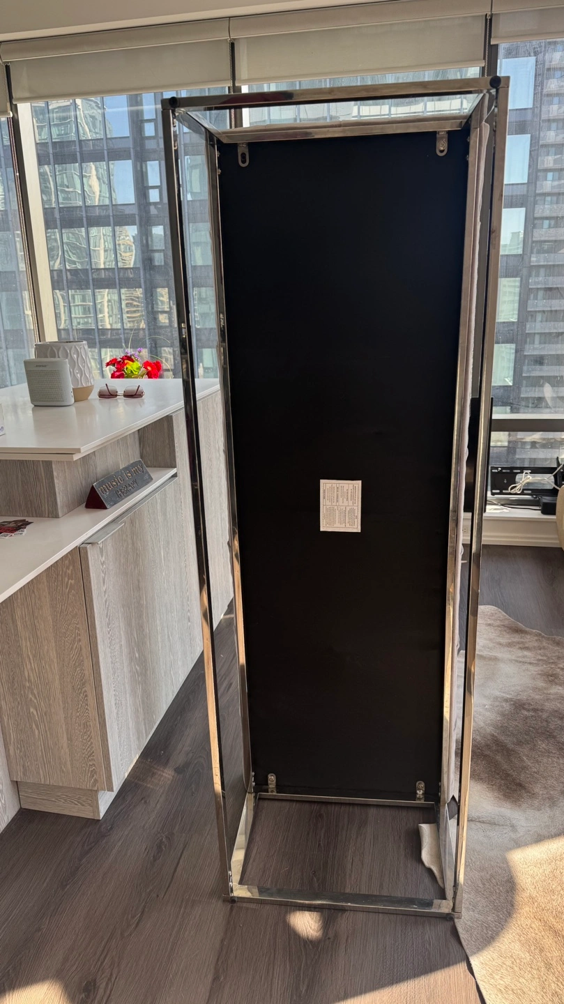 Stylish grey velvet bench. Features a button-tufted design and sleek metal legs. Perfect for entryway or bedroom. Modern design.