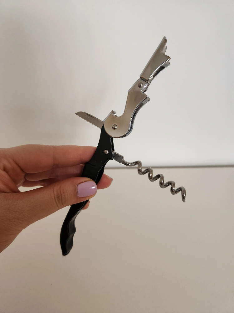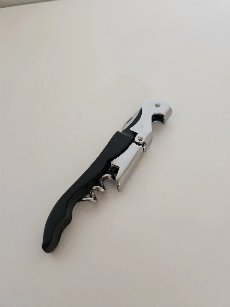 Multi-functional wine opener. Features a corkscrew, foil cutter, and bottle opener. Black handle, silver metal components. Lightweight and portable. Brand new!