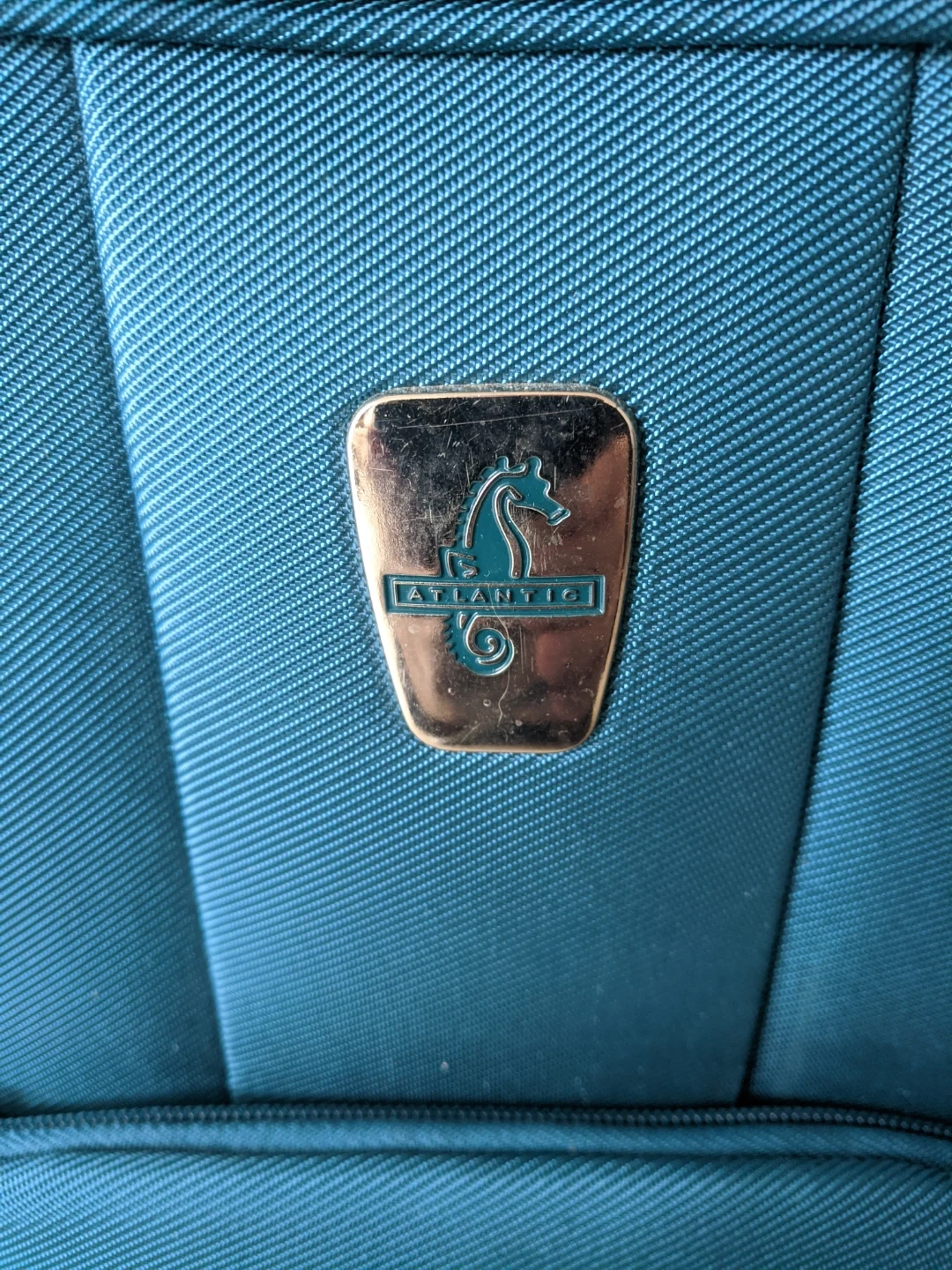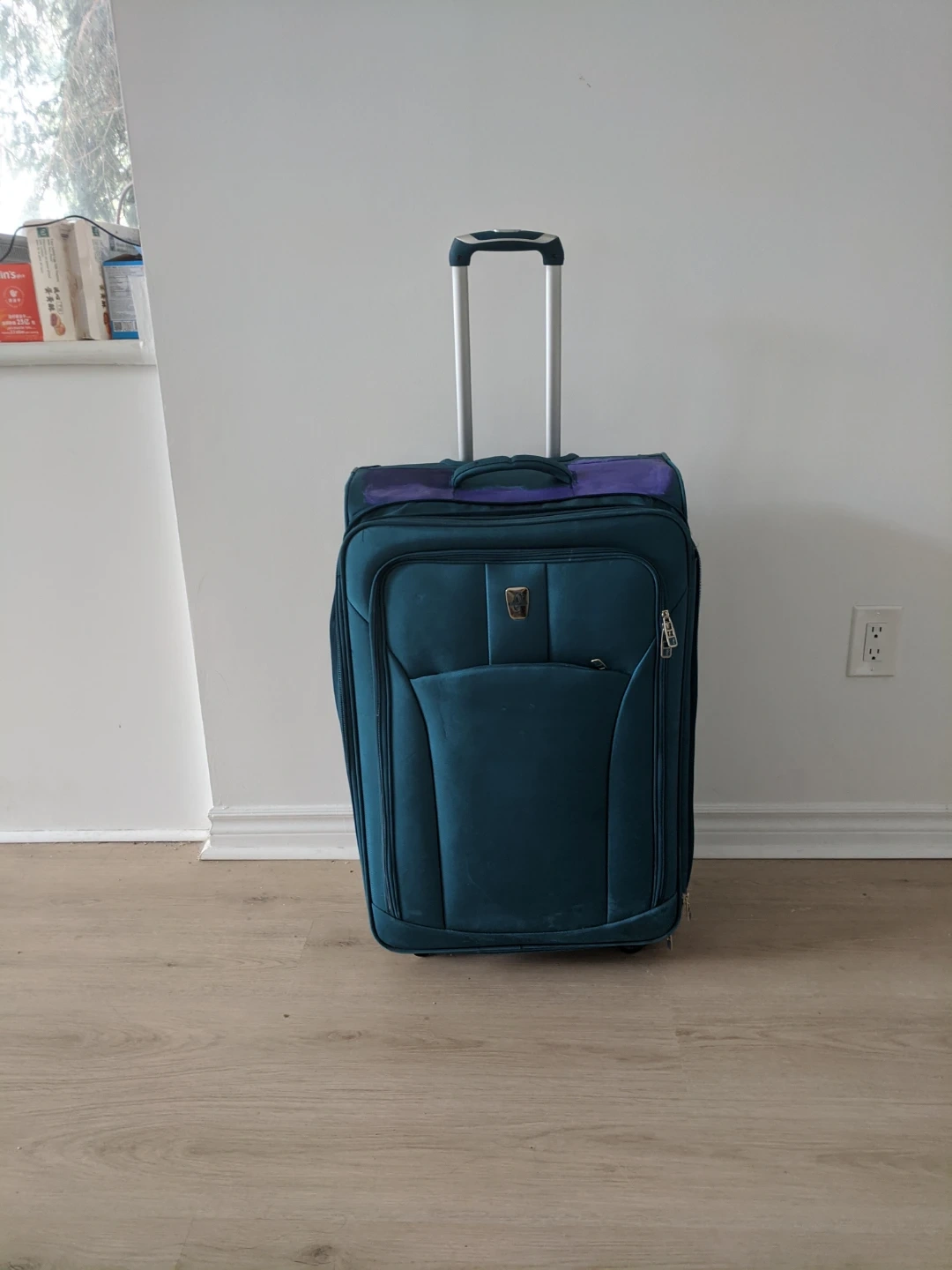 Teal rolling suitcase with purple accents and a retractable handle. It's made of durable fabric and has multiple zippered compartments. Wheels at the base for easy transport. Old but ok. Pick up at 195 Merton Street Toronto or pick up at subway station Davisvill. And I can deliver it to your house but you need to pay me another $3. Thanks.
