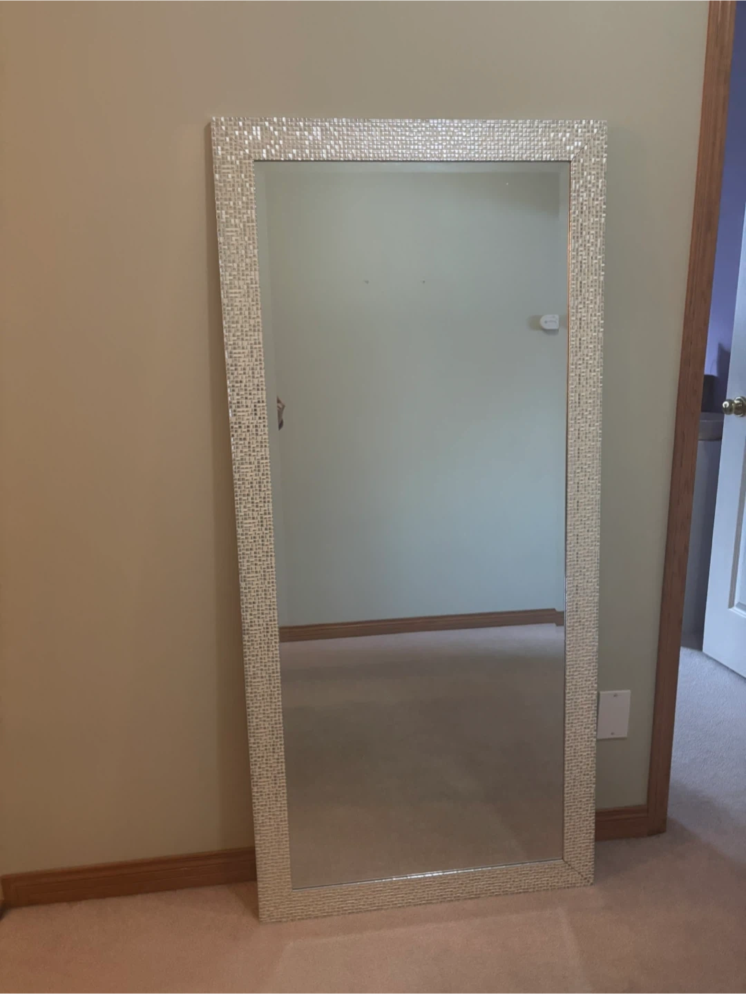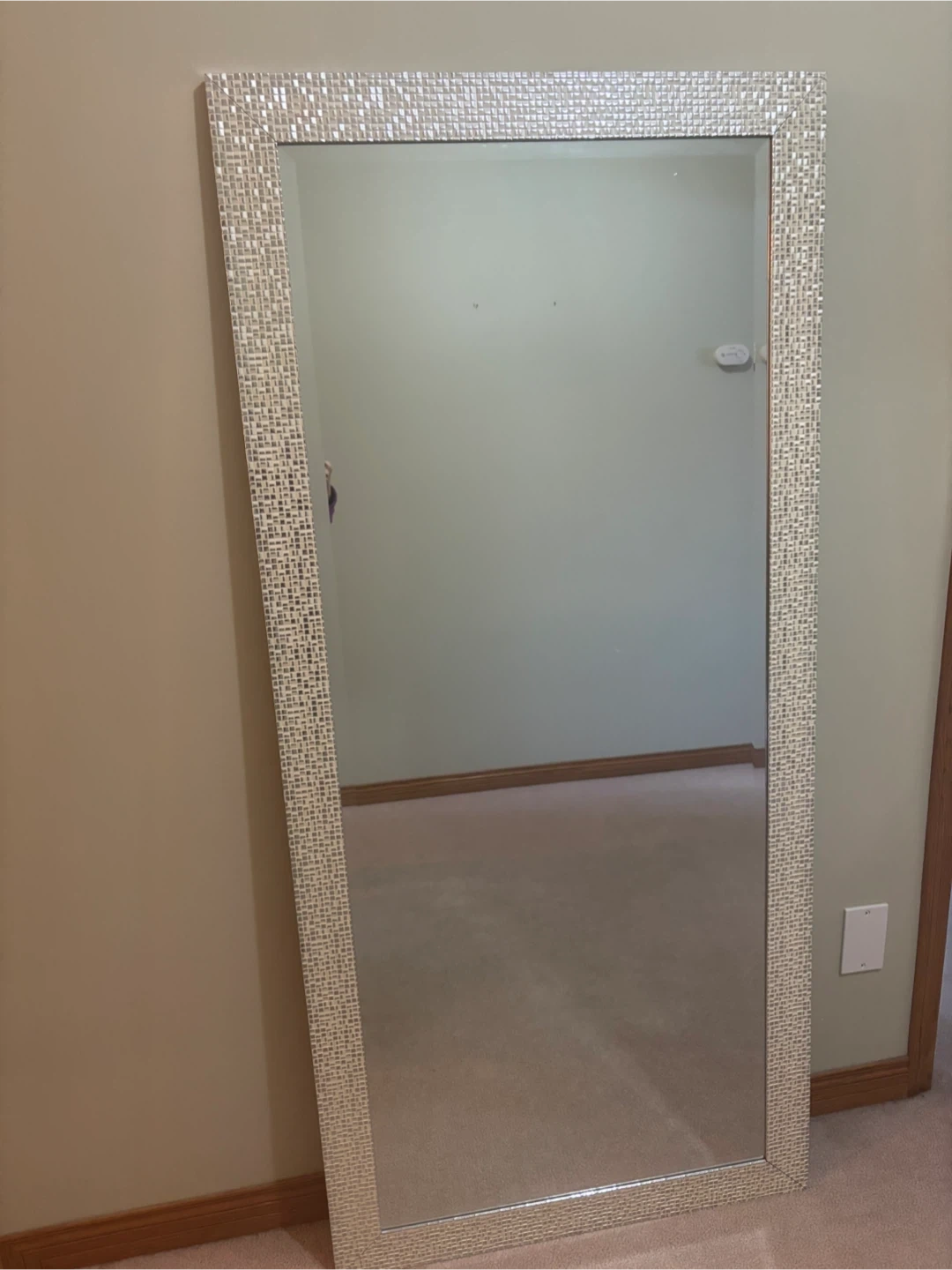 This full-length mirror features a decorative frame with a unique mosaic pattern. It's perfect for checking your outfit or adding a stylish touch to any room. Hang it using the D-rings for a secure installation.