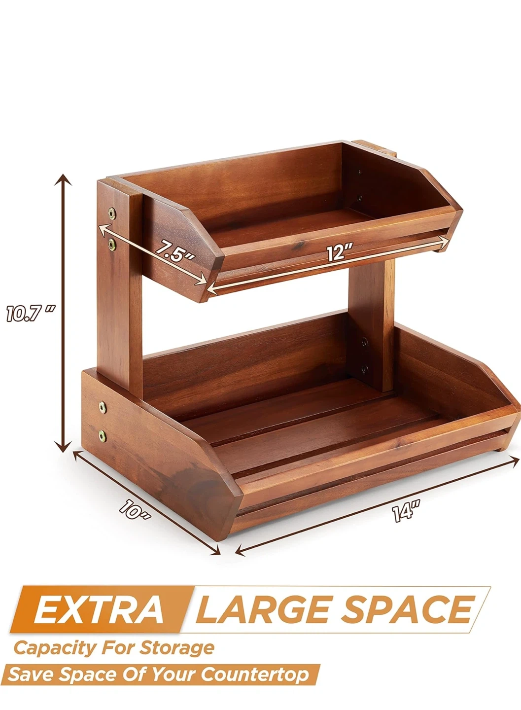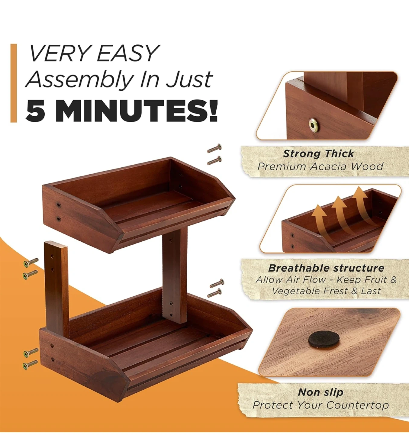 This two-tier wooden fruit basket is made from strong, thick premium acacia wood. It has a breathable structure that allows air flow to keep produce fresh. Non-slip pads protect your countertop.