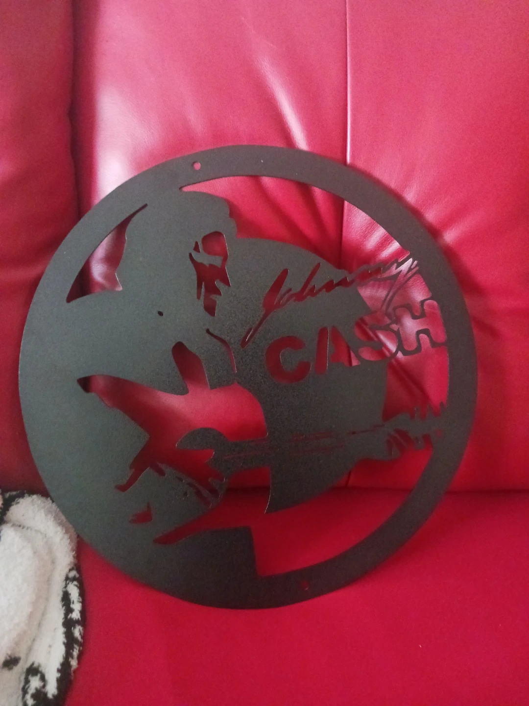 This is a round metal wall art piece featuring a silhouette of Johnny Cash, complete with his signature and "CASH". It's a cool decorative item for any fan's space. Looks like it's made of metal.