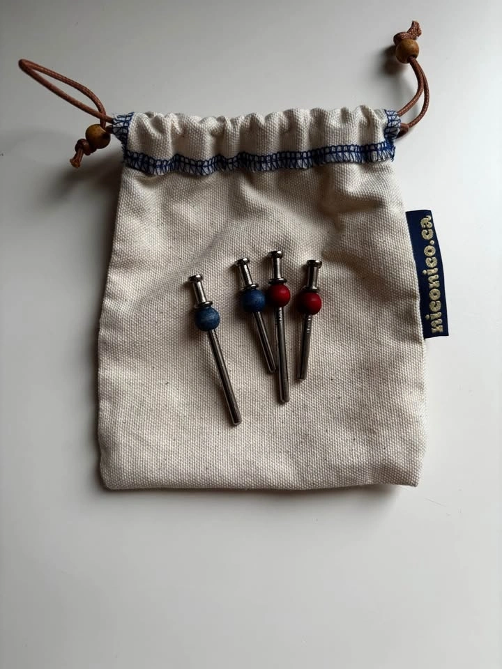 Solid wooden board with 4 metal pegs and a canvas sleeve for storage. Approximate size: 12” diameter. Perfect condition, comes in original box and is giftable.