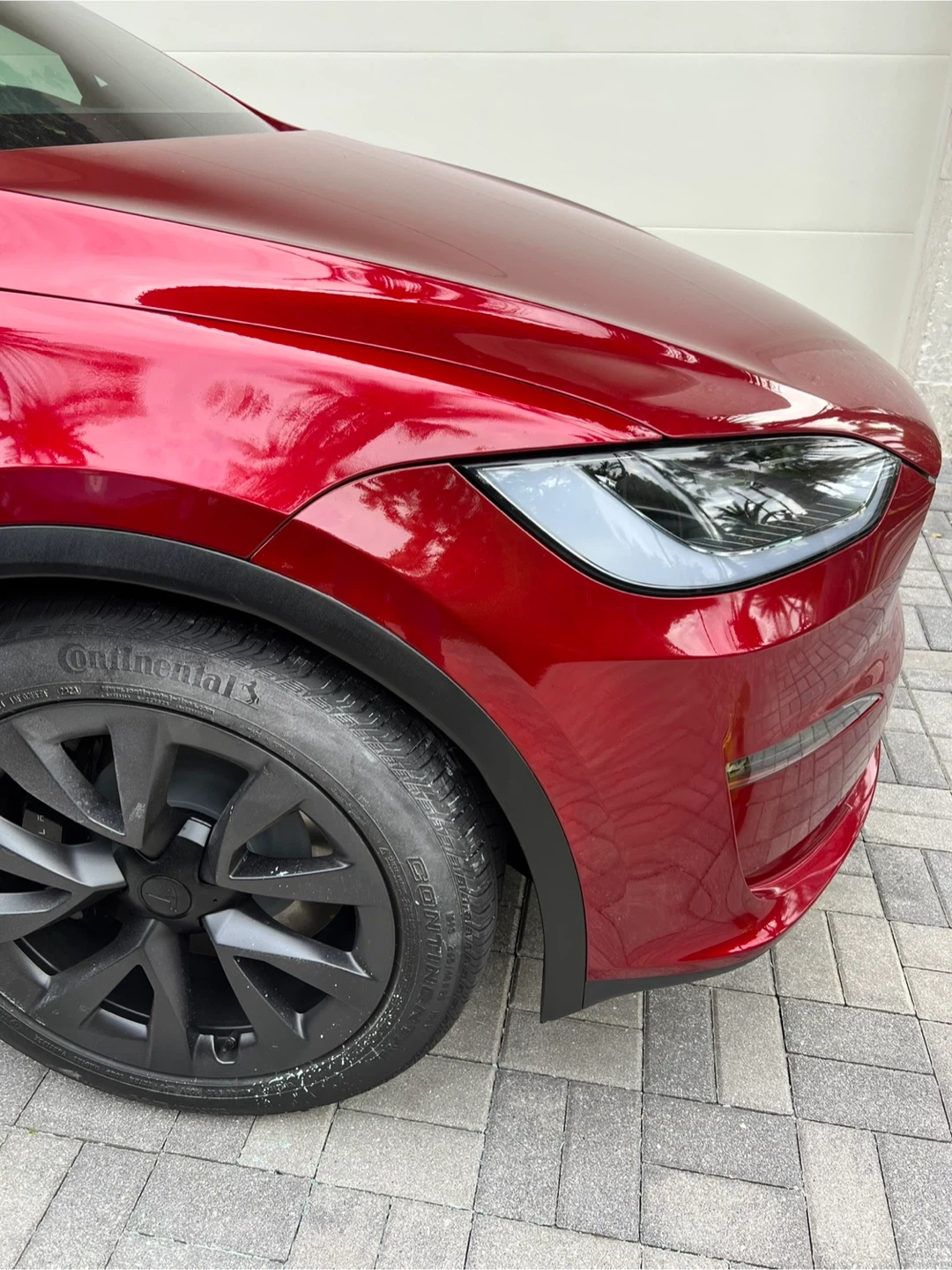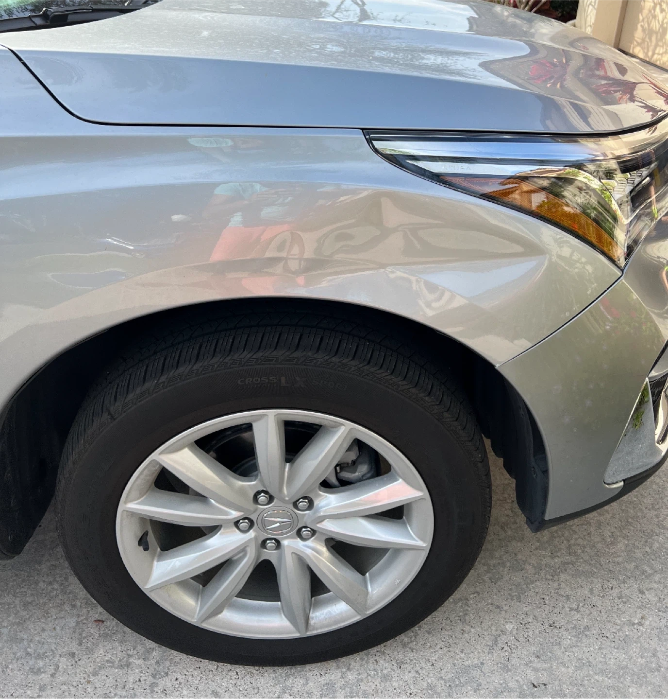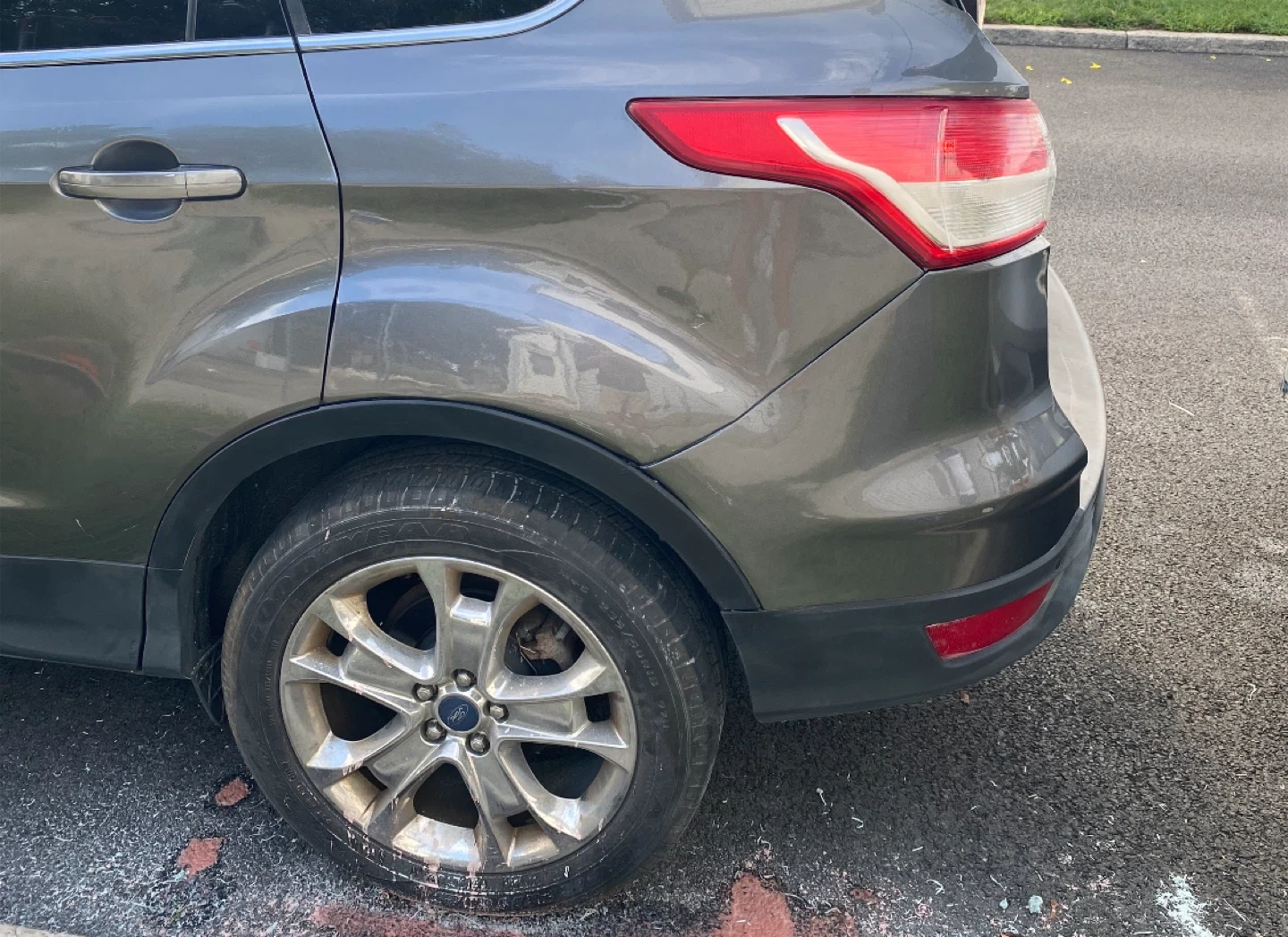 This listing is for a damaged rear quarter panel on a grey SUV. It shows significant dents and scraped paint. There's a large impact mark with visible damage to the body and trim. Sold as-is.