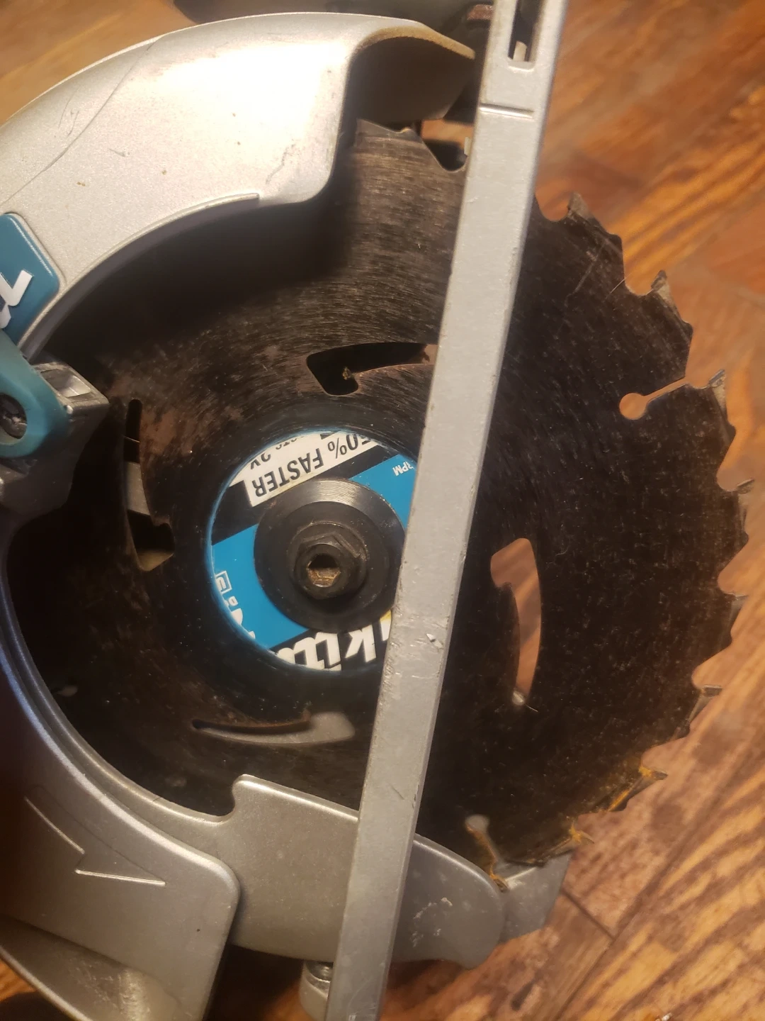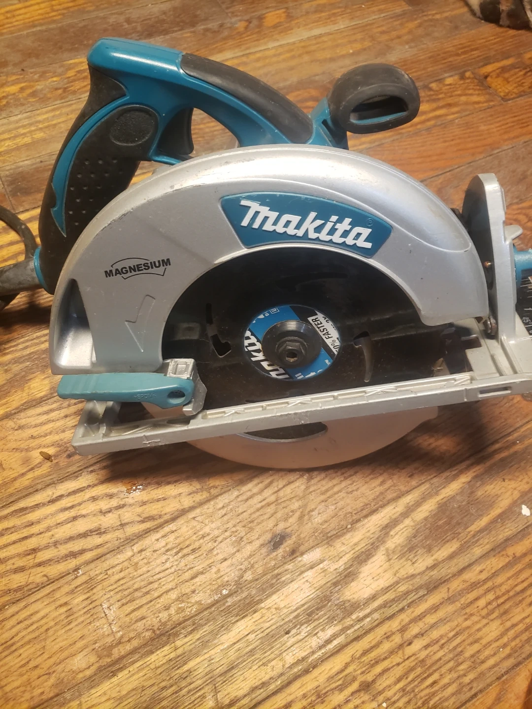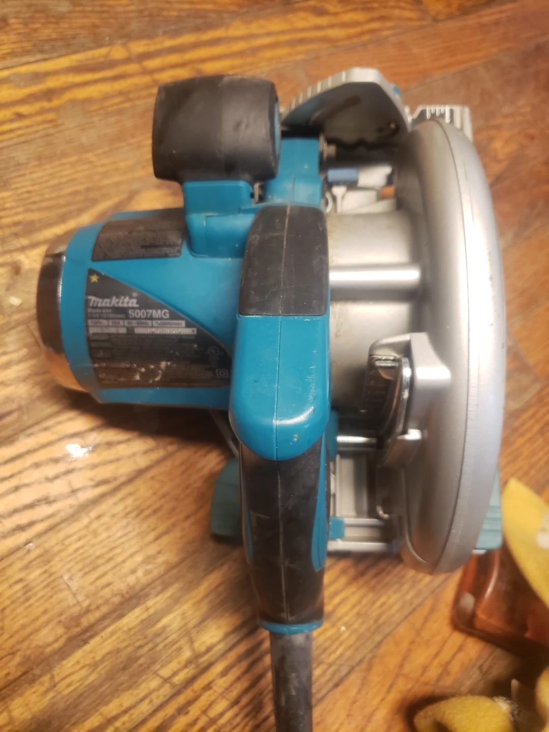 This is a Makita 5007MG circular saw with a 7-1/4 inch blade. It operates at 120V, 15A, and 50-60Hz with 5800 RPM. The housing is made of magnesium.