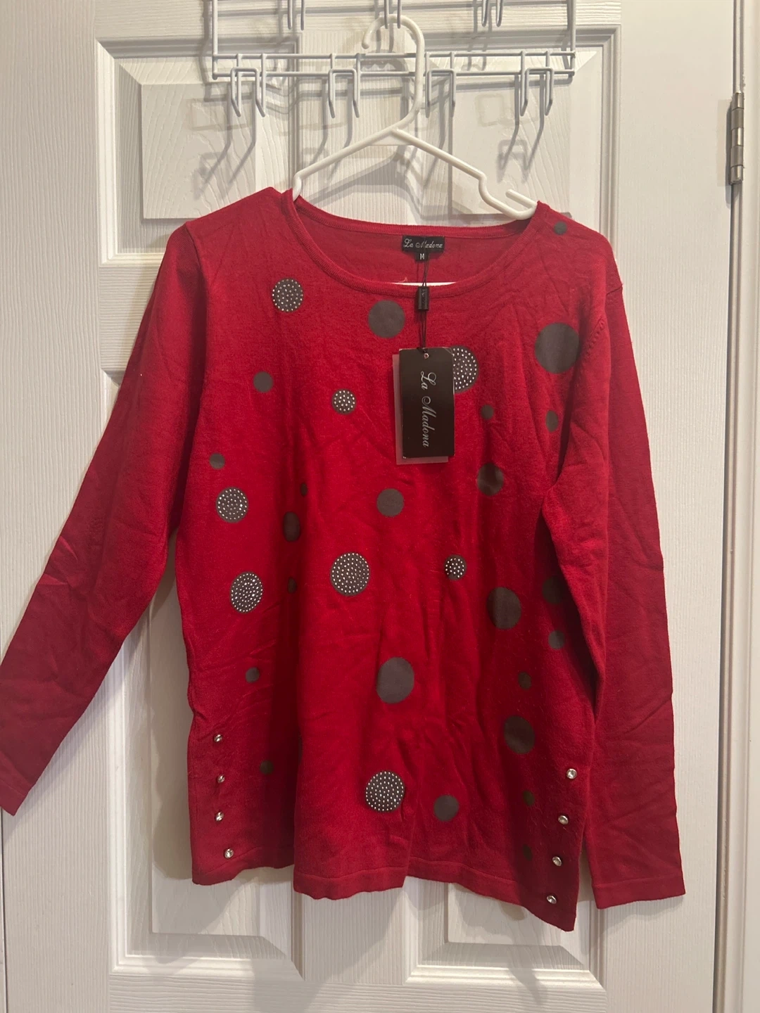 This La Moda sweater is a vibrant red with a long sleeve design. It's decorated with an array of grey polka dots and sparkling embellishments. It has decorative buttons along the side seams.