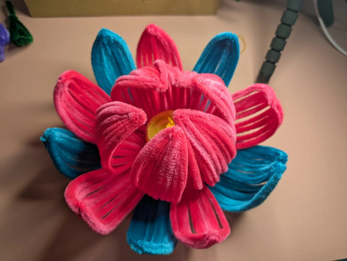 A unique handmade flower decoration crafted from colourful pipe cleaners. It features vibrant pink and teal petals with a glowing yellow centre. This decorative piece adds a pop of colour and light to any space. It's a lovely handmade accent for a desk or shelf!