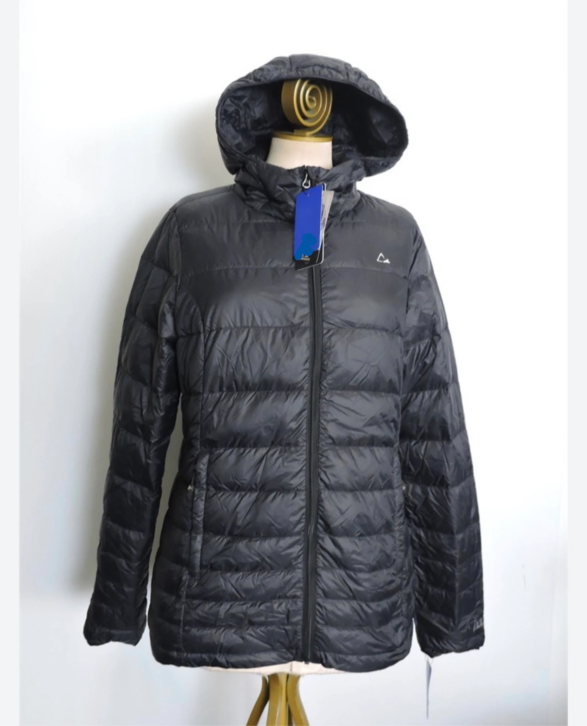 Black hooded down-filled puffer jacket. It's lightweight and great for layering. It has a full zip front and two zippered hand pockets. This jacket is ideal for cool weather outdoor activities.