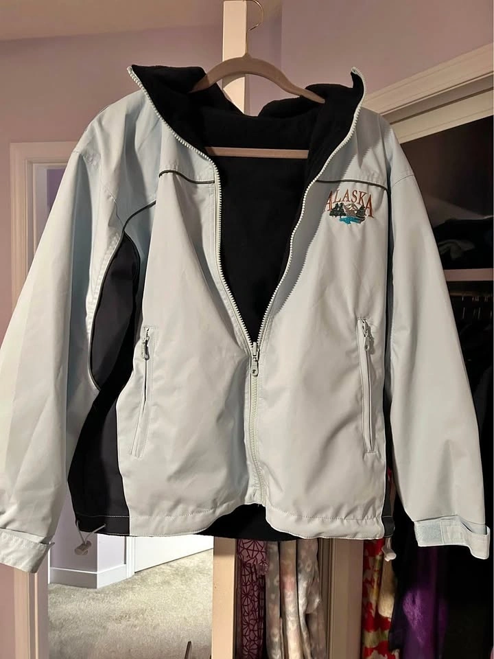 When we were in Alaska on our Disney Cruise I ended up buying 2 of these jackets of different colors. I am selling this one and it is brand new and never been worn. It has a warm fleece and is great for these cooler days. It is size XS and that is a unisex size so fits like a 10/12 for women.