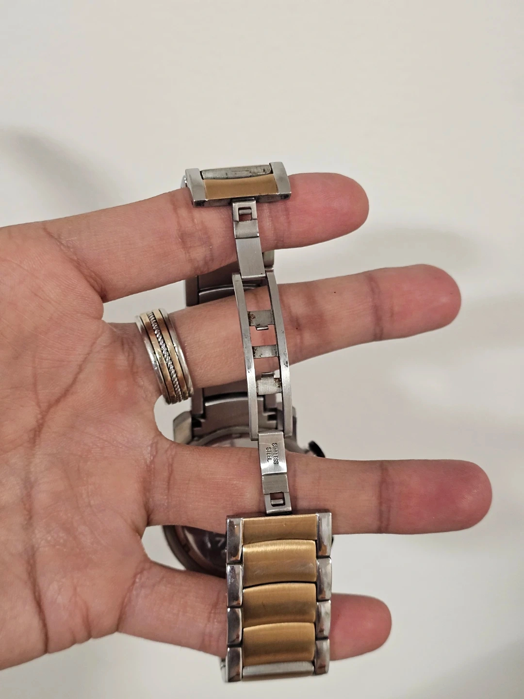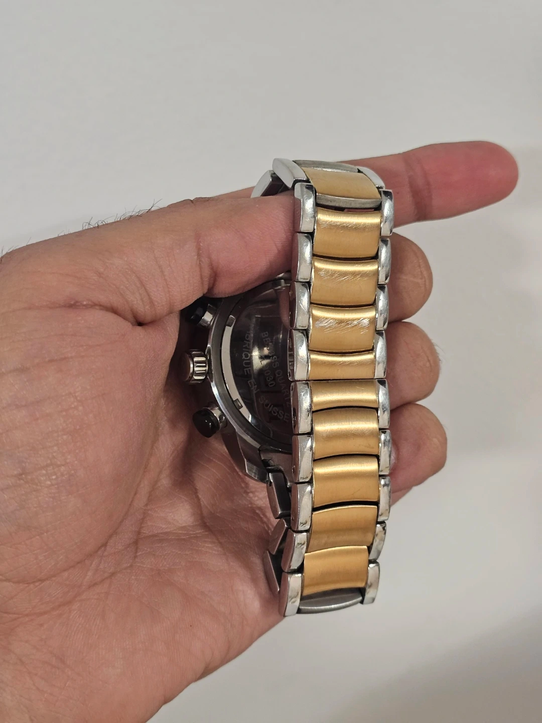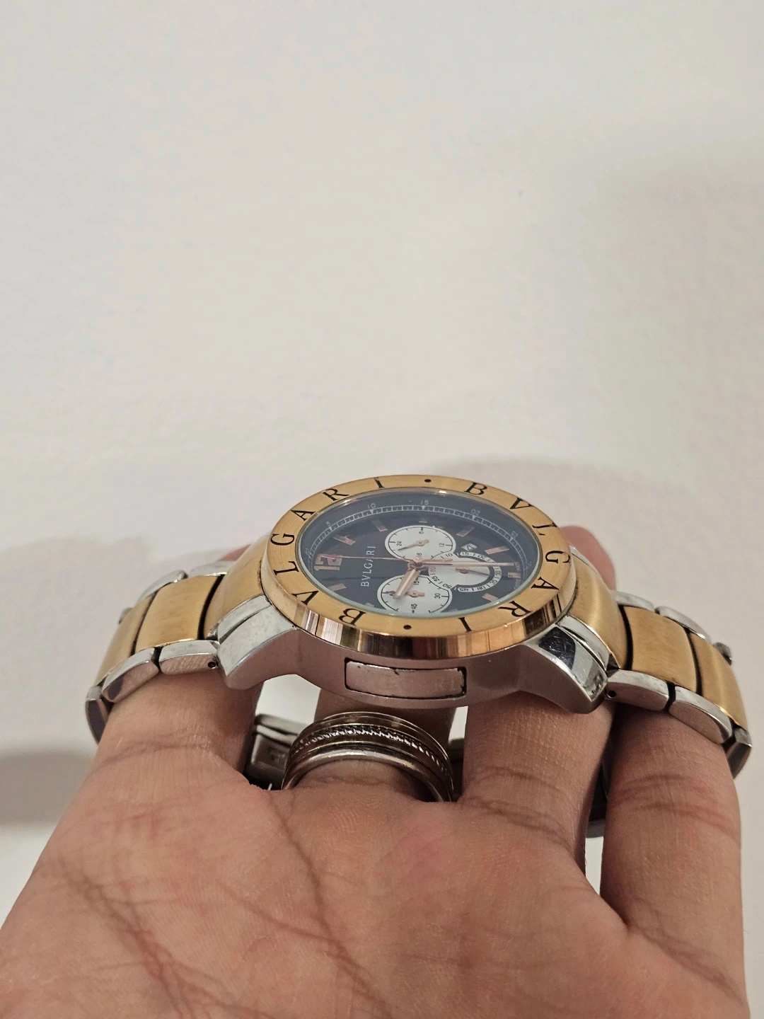 Bvlgari rep 1:1 watch with a two-tone stainless steel and gold-coloured metal bracelet. It features a black dial with chronograph subdials and a date window. The case is steel with a gold bezel.