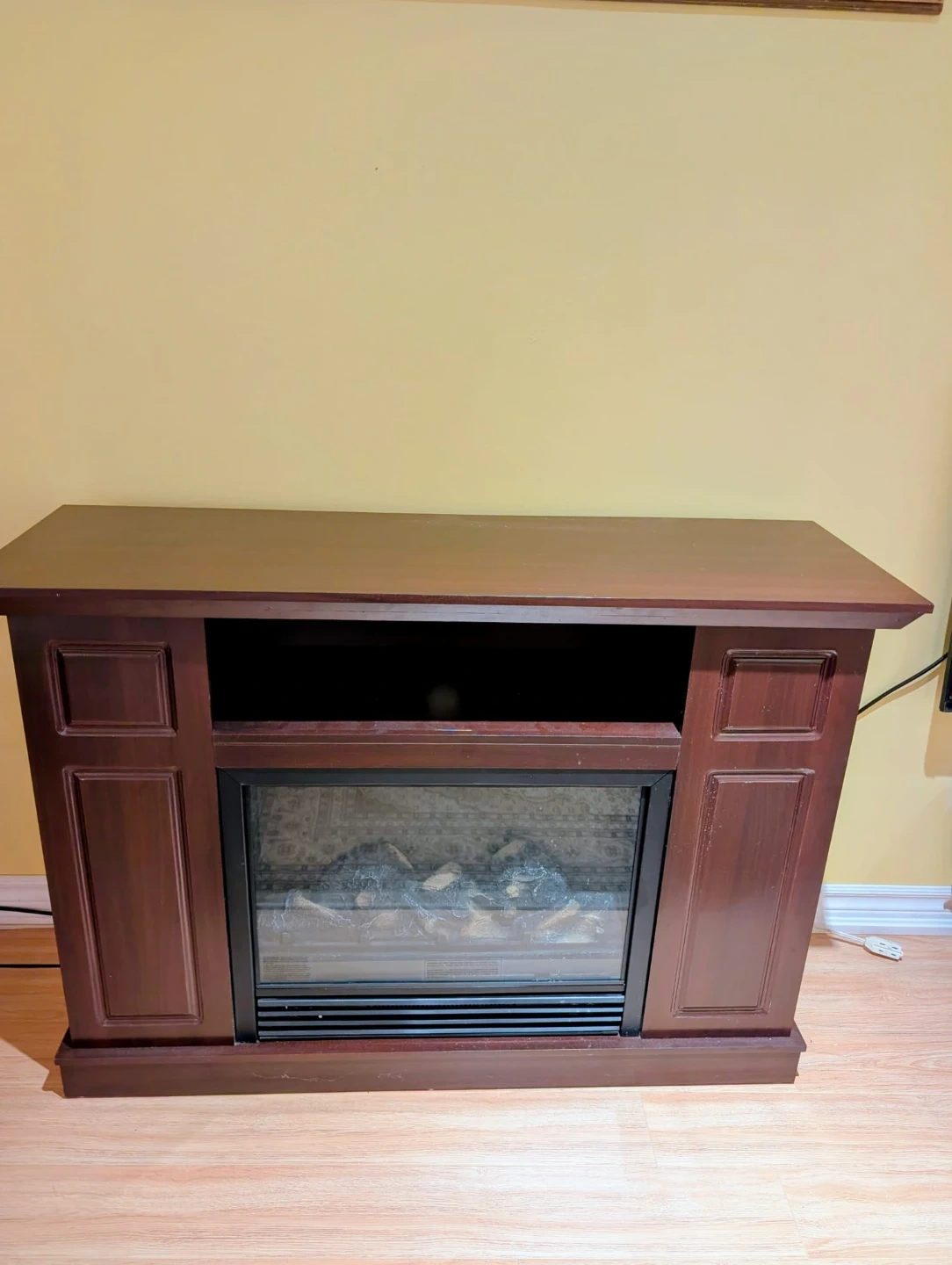 Dark wood electric fireplace entertainment stand for your TV or decor.