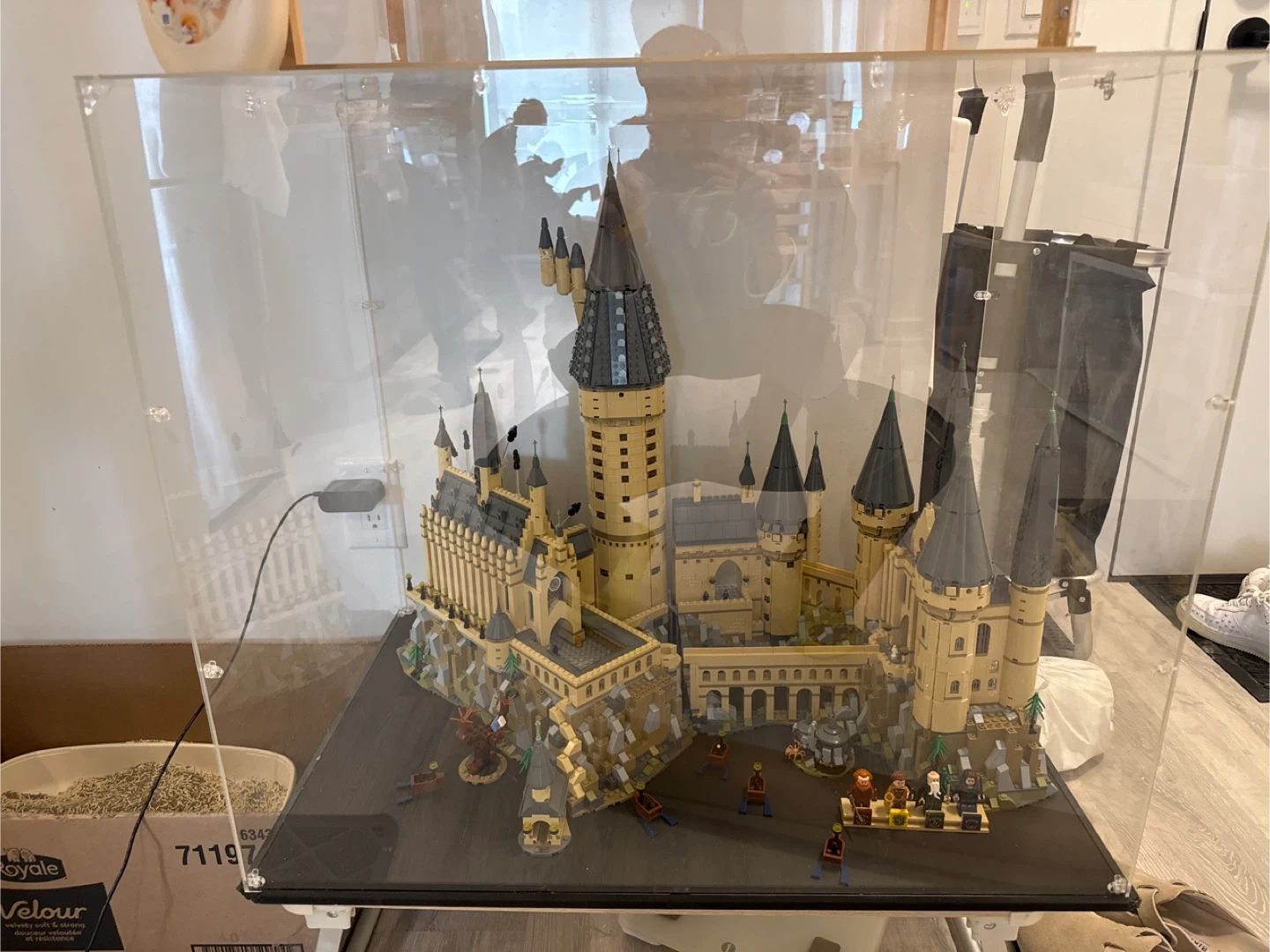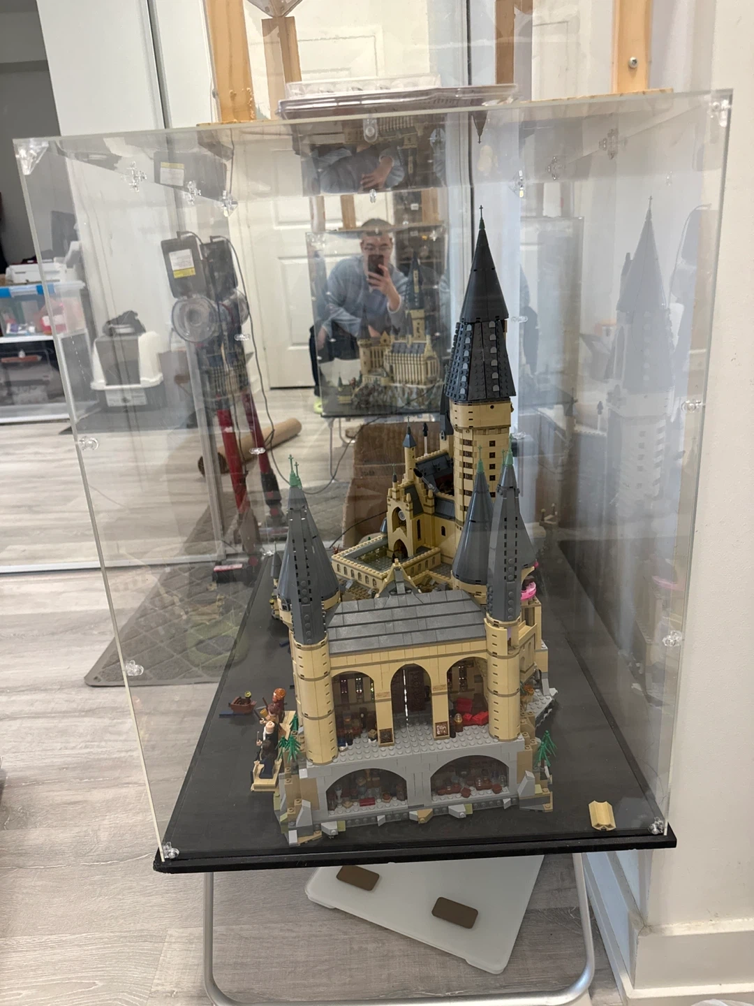 This is a custom acrylic display case designed for the LEGO Harry Potter Hogwarts Castle set. It features a clear construction to showcase the intricate details of the build. The case protects the model from dust and damage.
