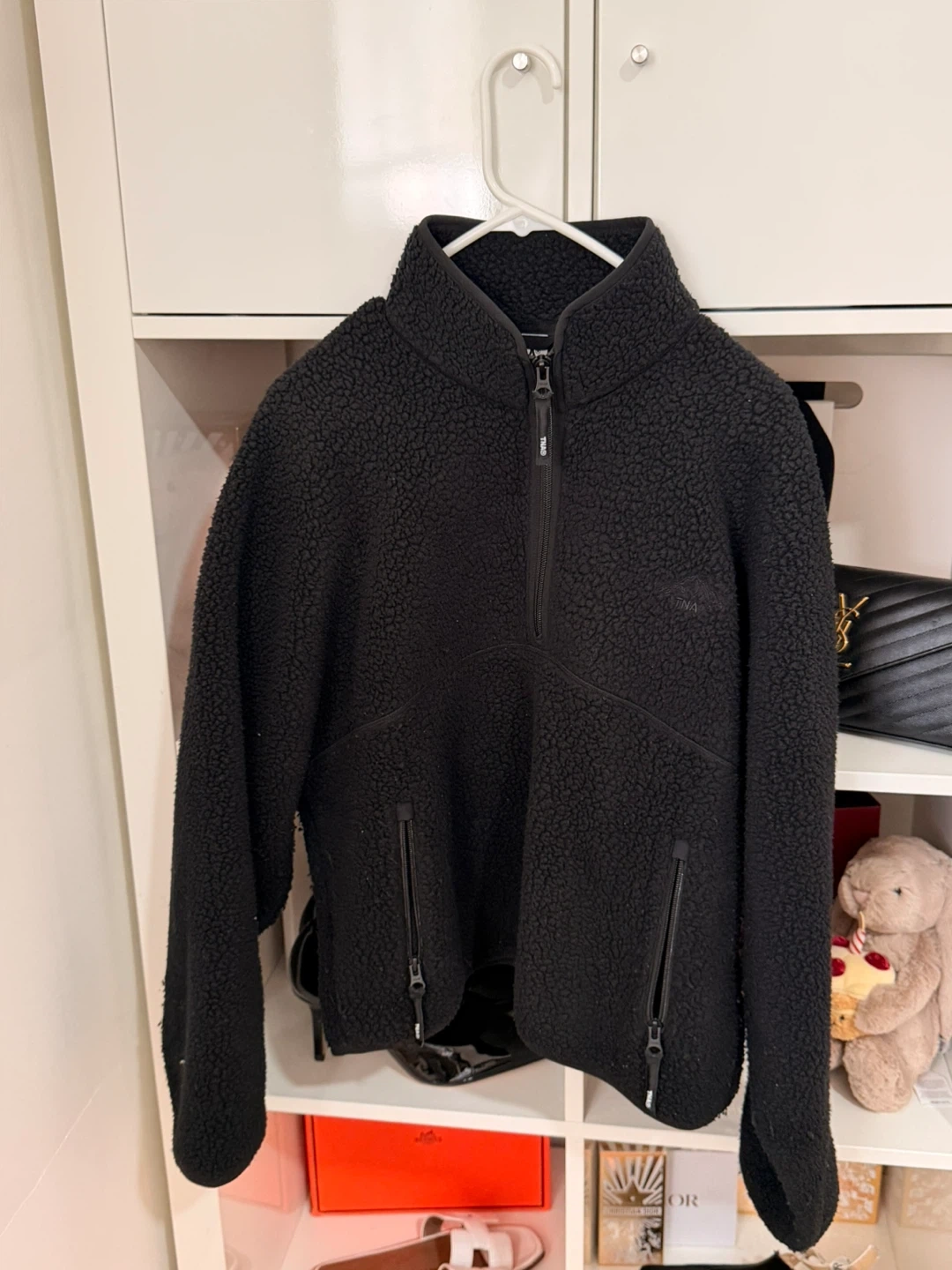 Cozy black fleece jacket from TNA, part of Aritzia. It's a size medium with a half-zip closure and zippered pockets. Perfect for keeping warm on cooler days!