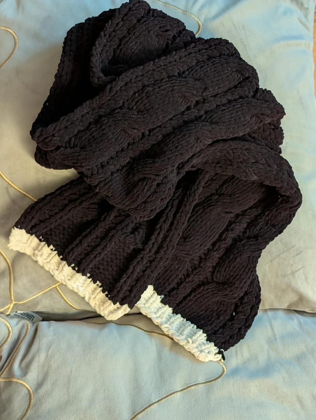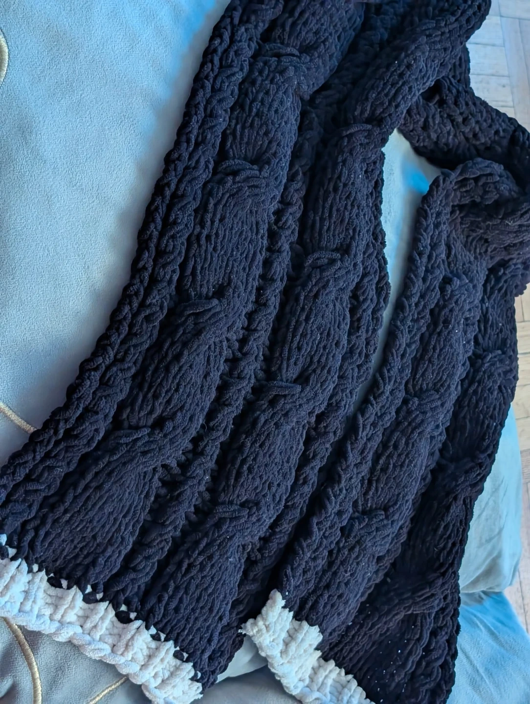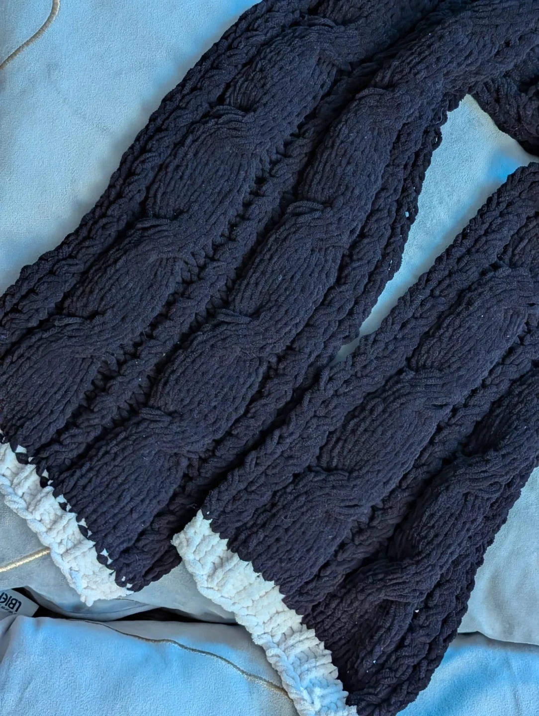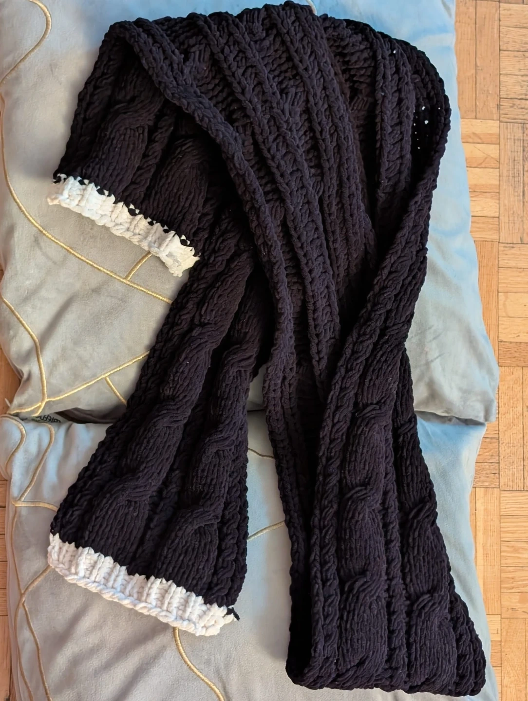 A cozy, black chunky knit scarf. It's super soft and features a cable knit pattern with a contrasting white trim along the edges. Perfect for staying warm during the colder months!